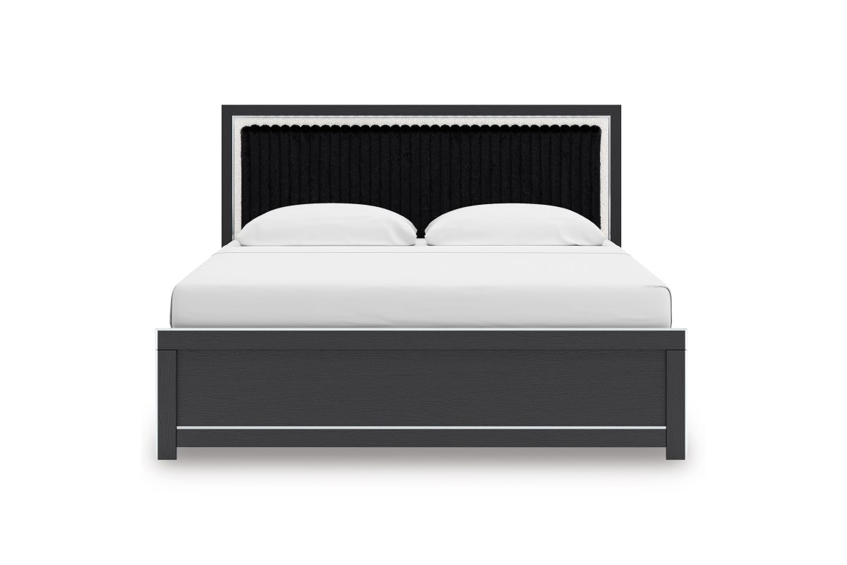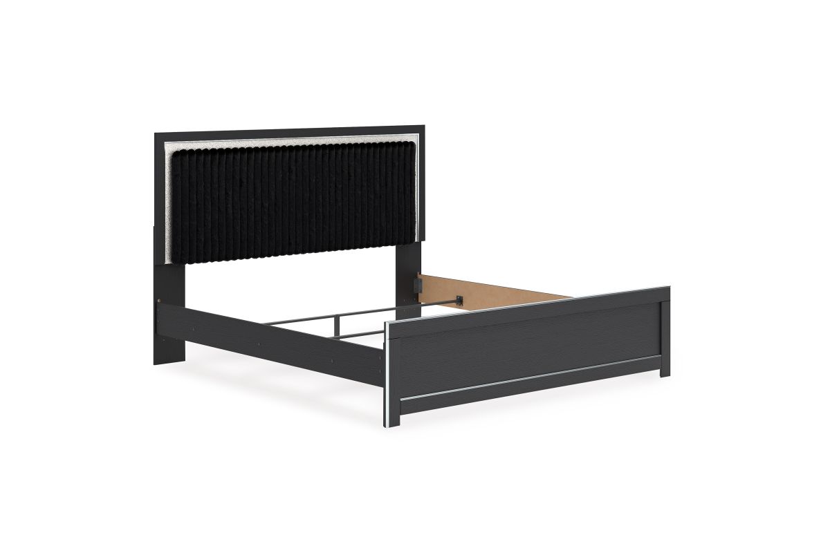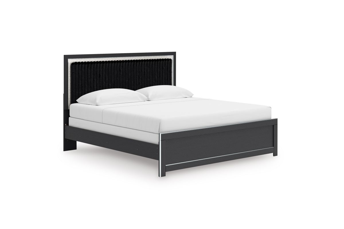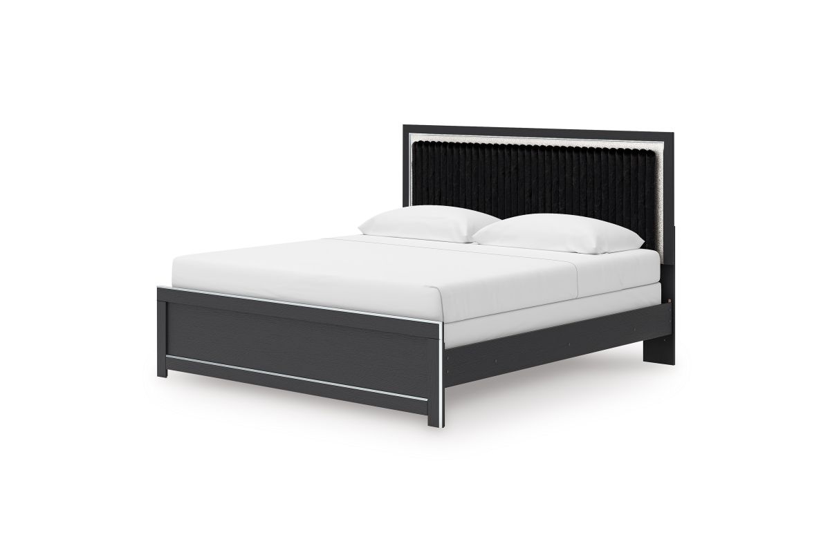 If glitz and glam are your jam, you’re gonna love this king upholstered panel bed. Gleaming glitter and dazzling chrome-tone touches are paired with tufted black faux fur for a stunning pop of pizzazz. Loaded with chic flair and serious sparkle, it's a simply splendid way to wake up your inner sanctum’s style.