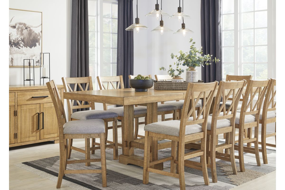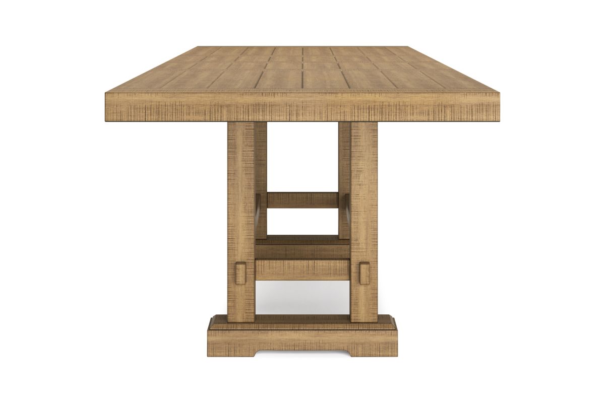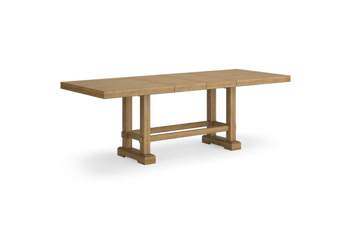 This counter height dining table is a favorite for casual rustic interiors. Offering plenty of seating space, it's your answer for everyday living and impromptu guests. And the distressed pine finish, double trestle base and two extension leaves? Deliciously charming and versatile.