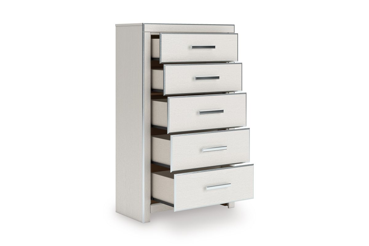 If glitz and glam are your jam, you’re gonna love this chest of drawers. Dazzling chrome-tone touches wow against a sophisticated matte white finish for a pop of stunning pizzazz. And the spacious storage drawers, with large-scale handles and faceted details, don’t disappoint. Loaded with serious sparkle, it's a simply splendid way to wake up your inner sanctum’s style.