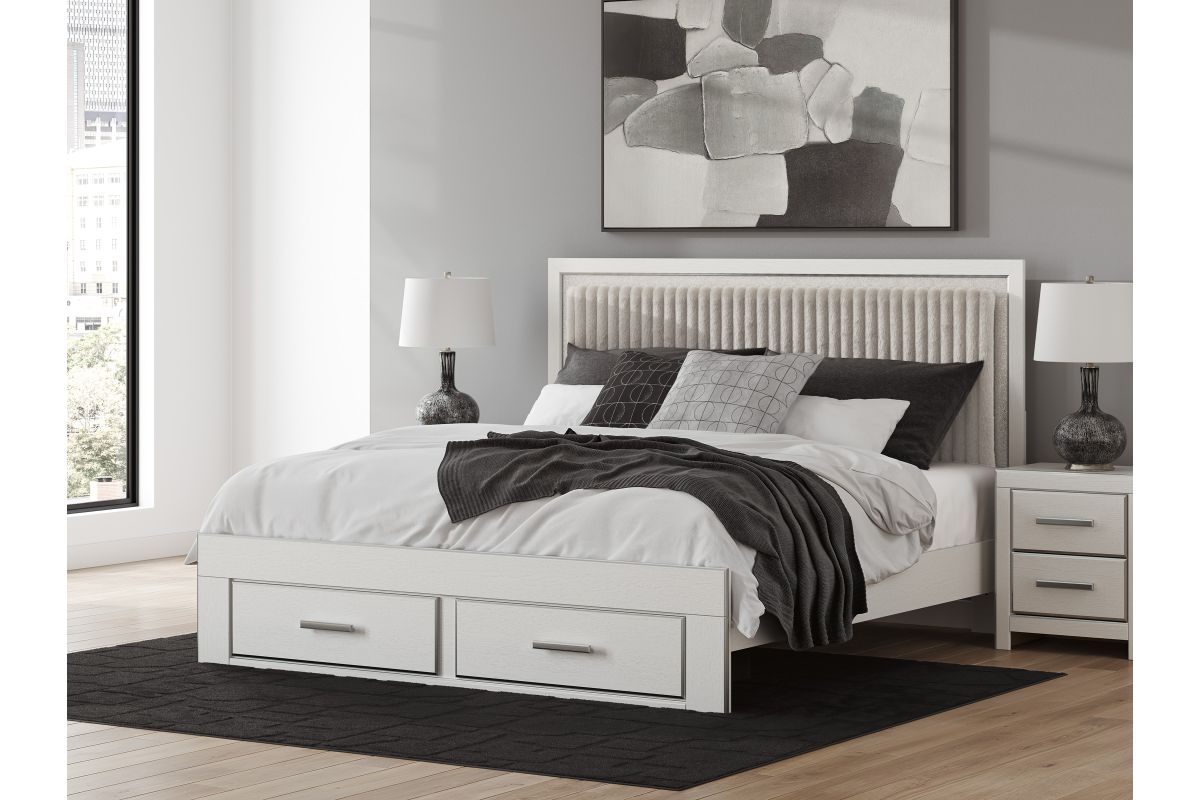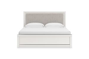 - Includes upholstered panel headboard, storage footboard, platform rails and roll slats