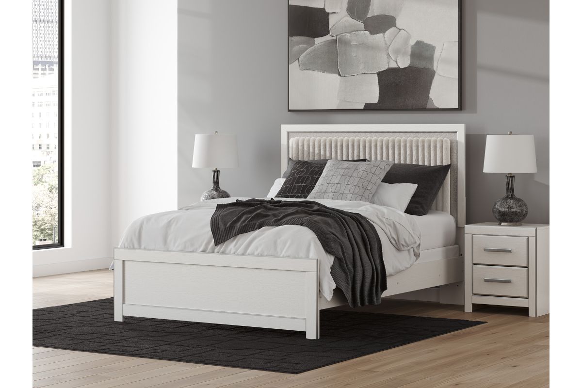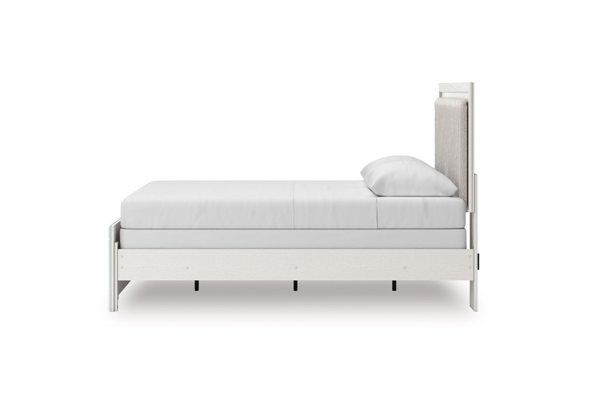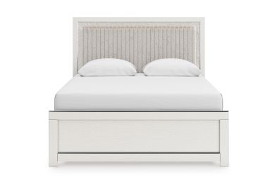 - Includes upholstered panel headboard, panel footboard and panel rails