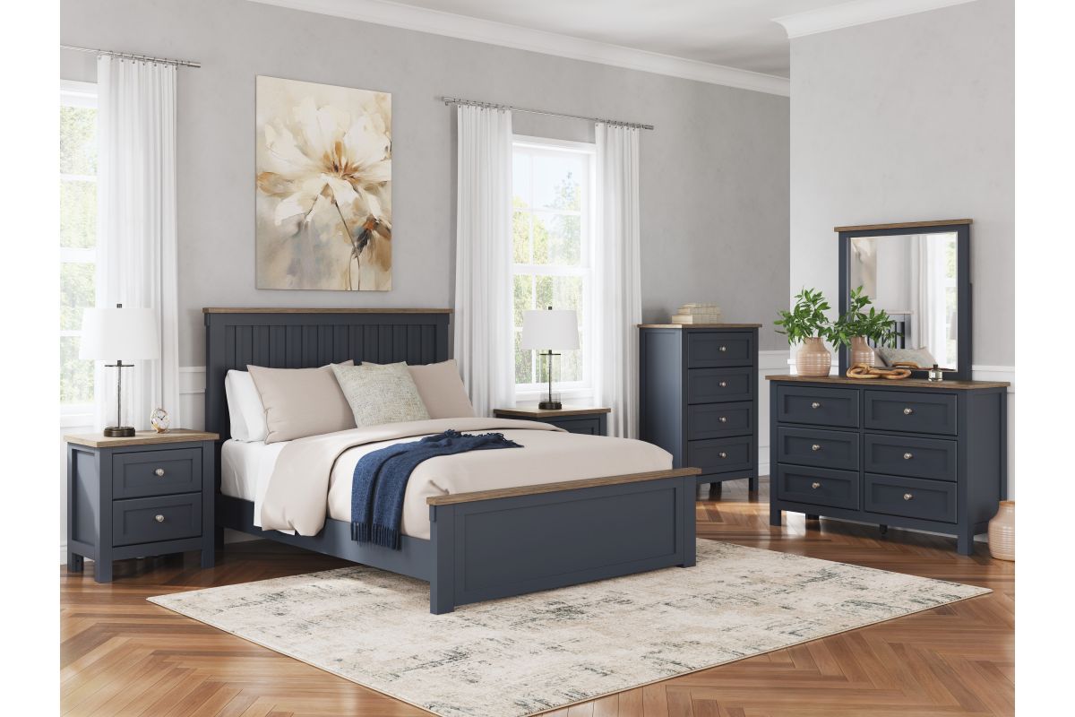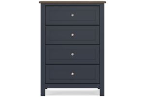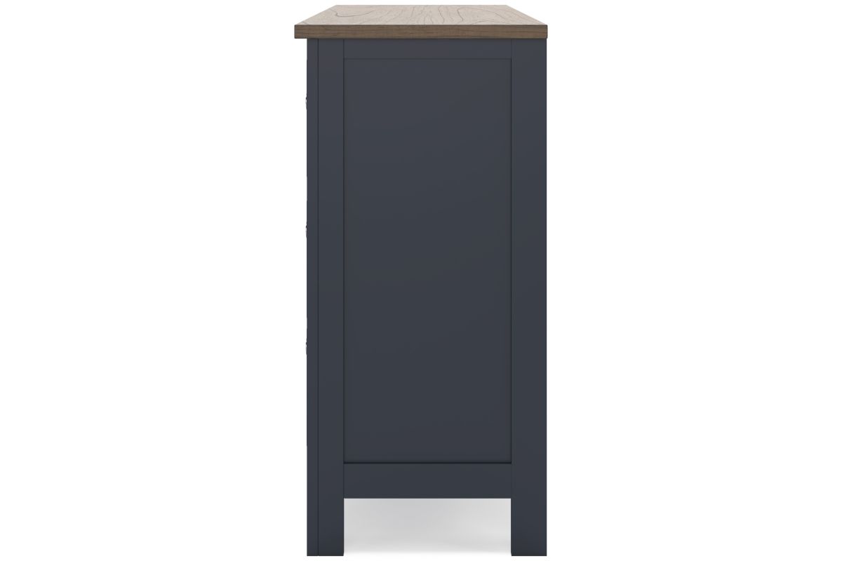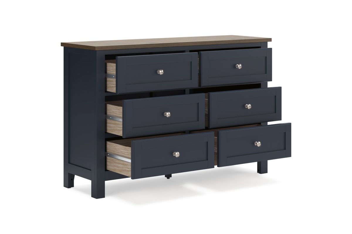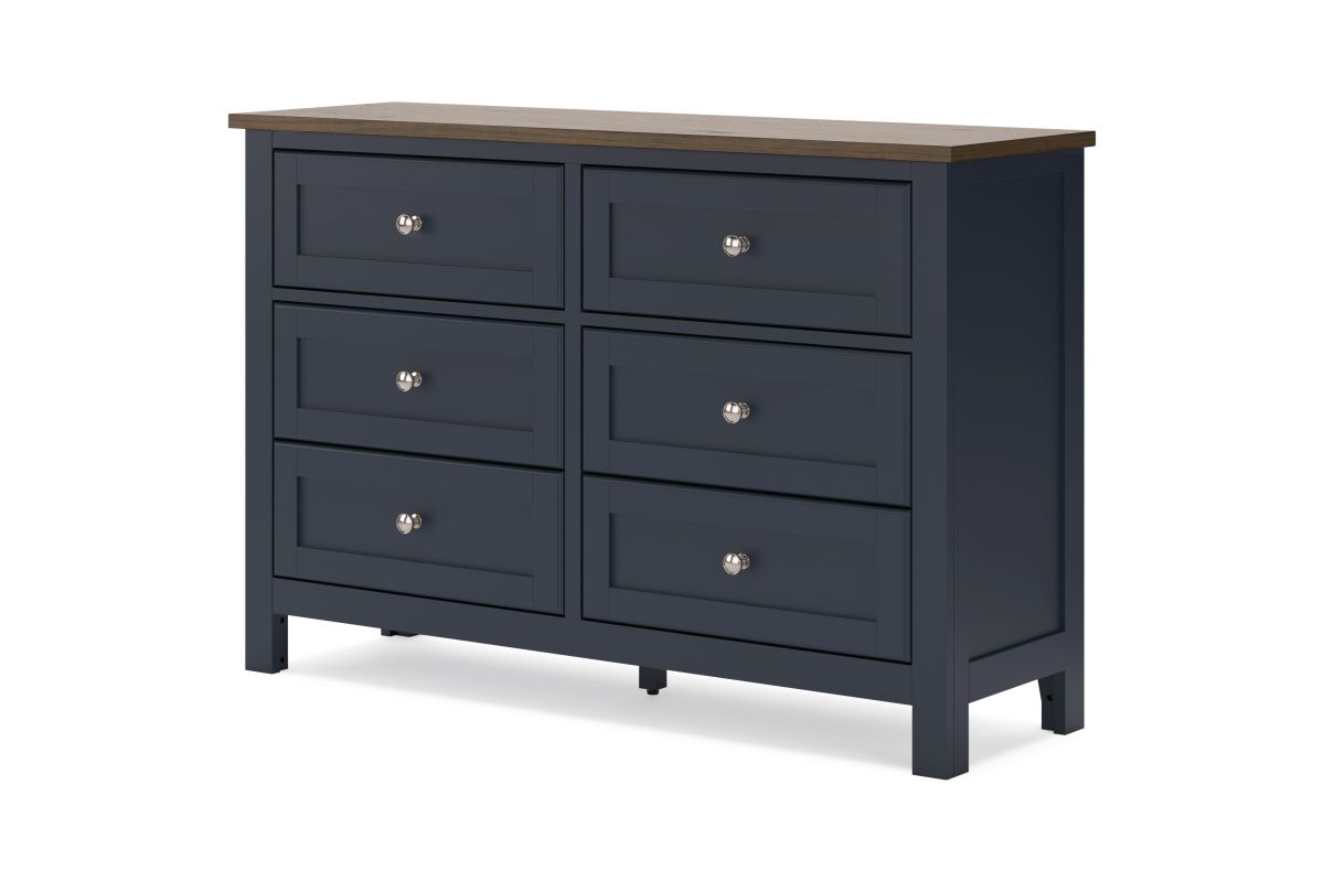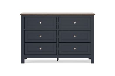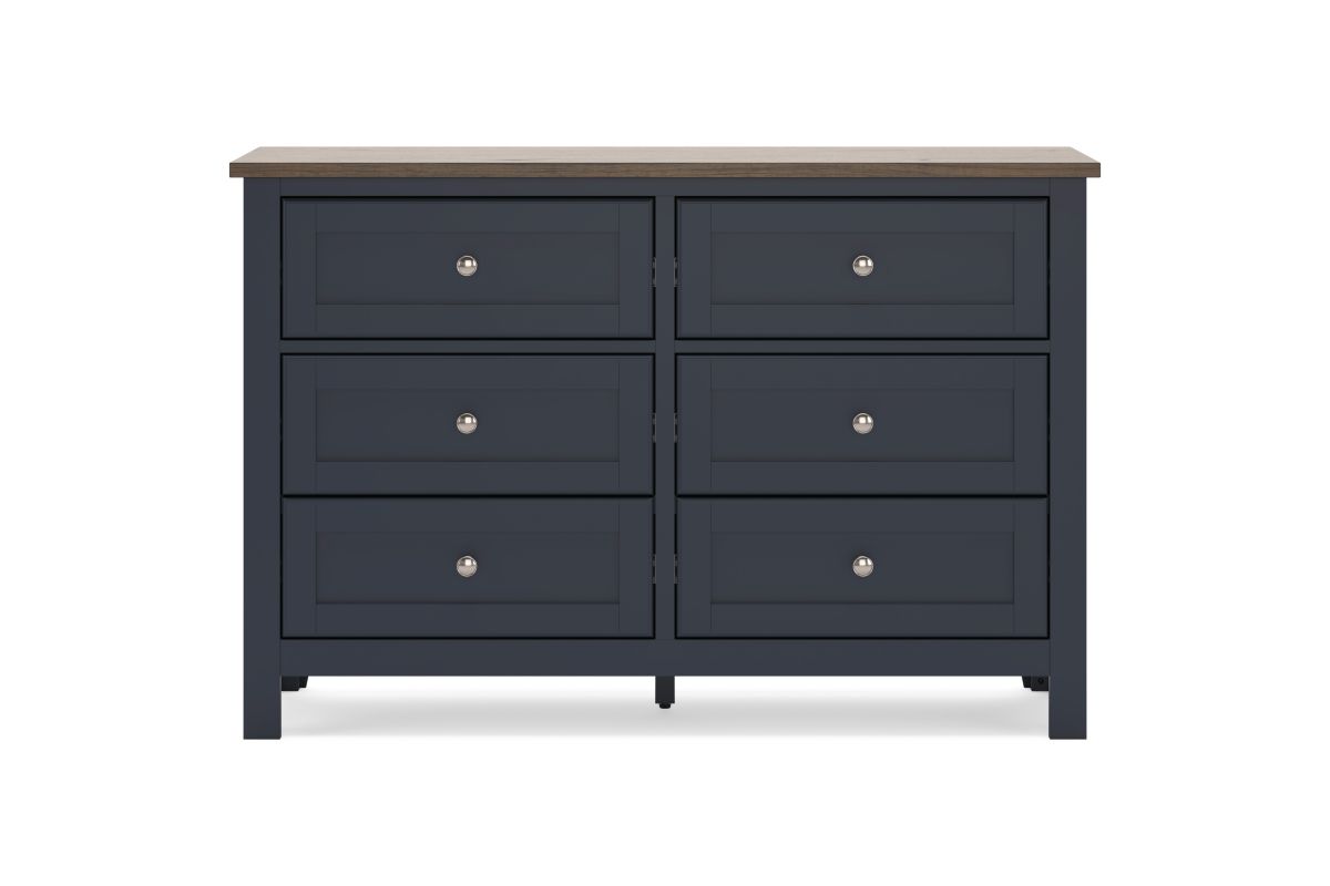 Add homespun charm to your restful retreat. A modern take on a timeless silhouette, this dresser pairs a dark slate blue finish with a light brown top. Drawer fronts and legs in a classic Shaker style bring an air of beautiful simplicity to the bedroom. Whether it's part of a charmingly curated guest suite or a casually carefree kids room, this dresser is a welcome addition.
