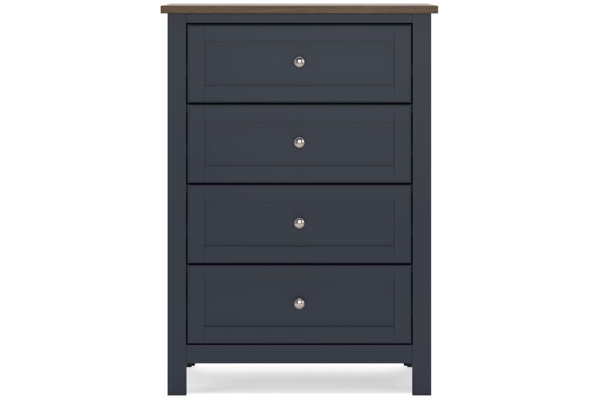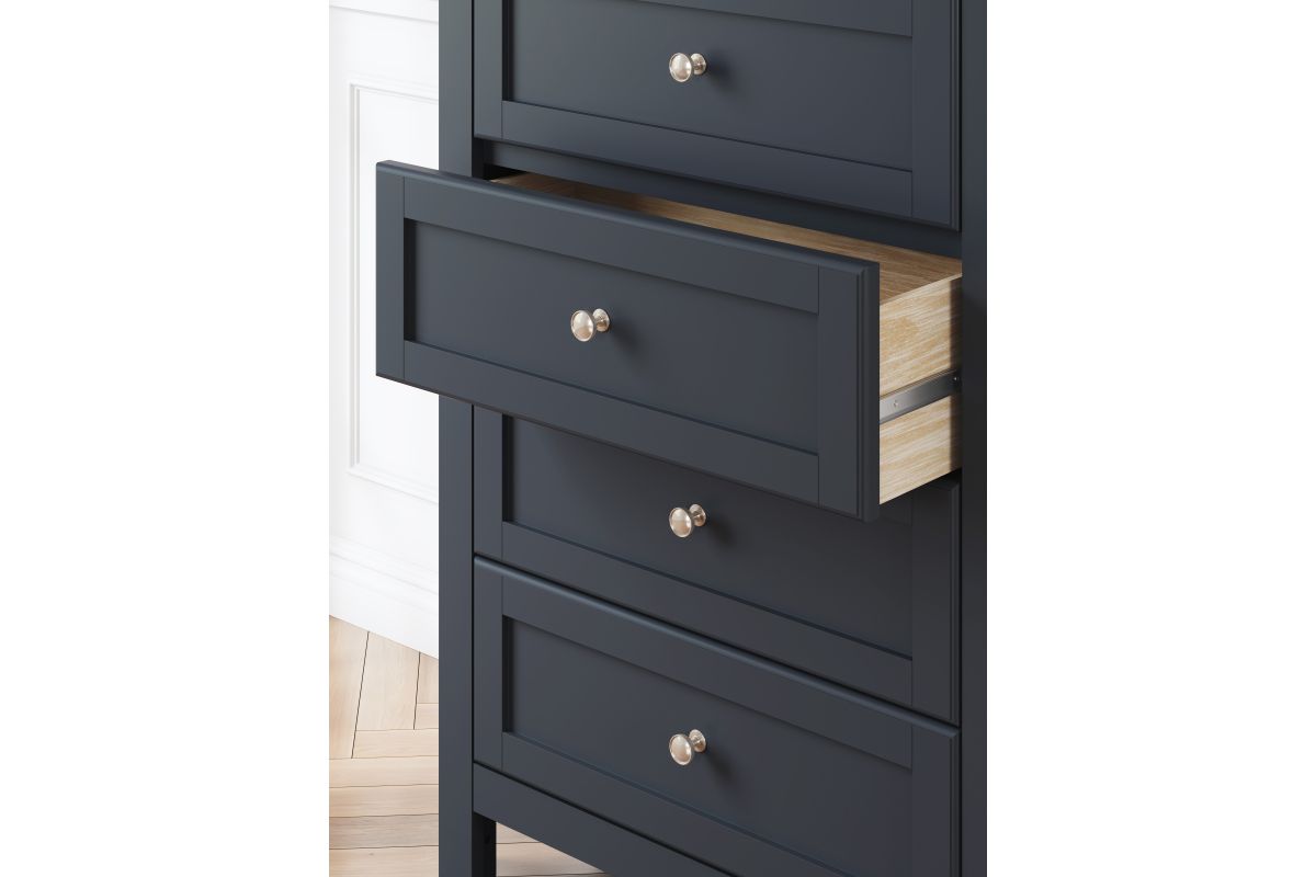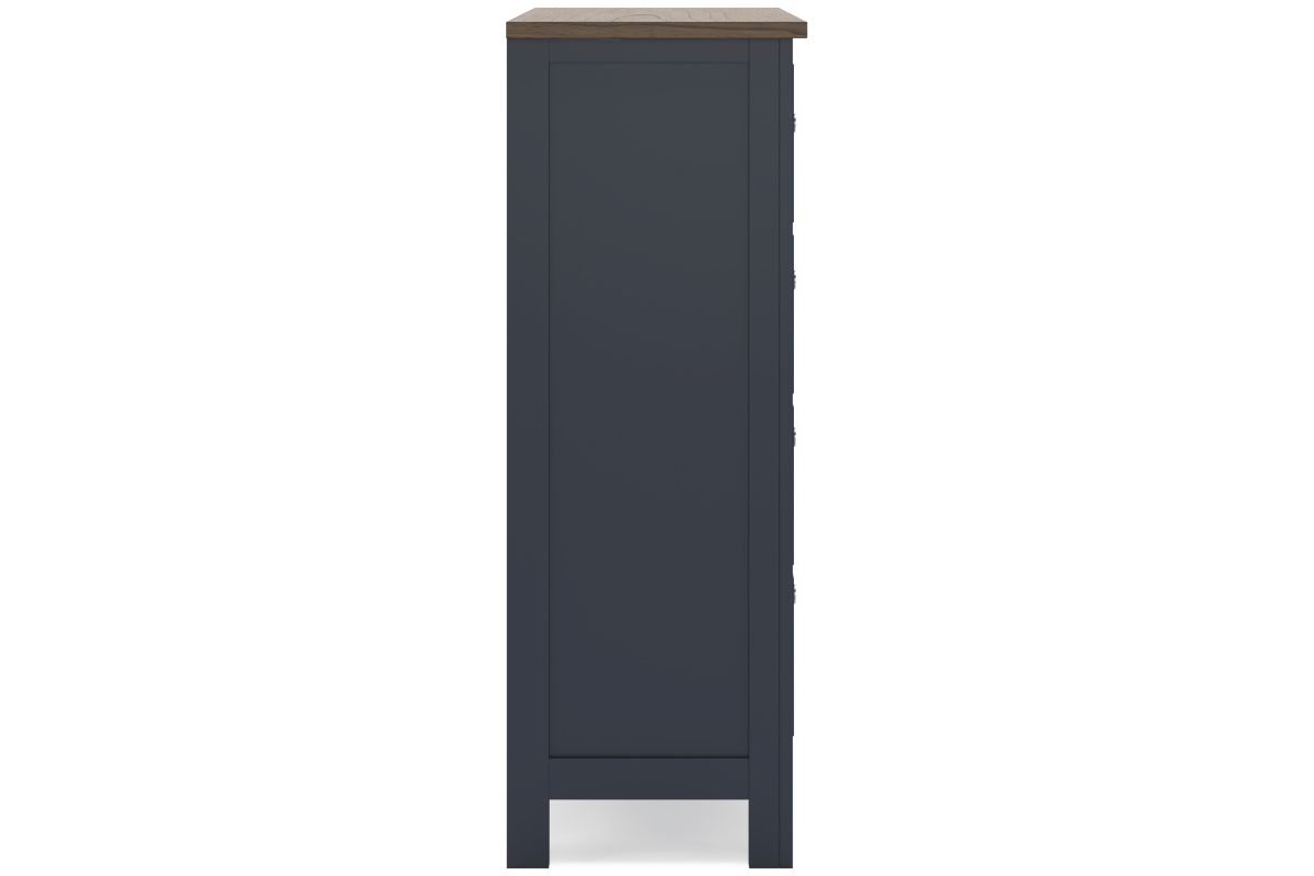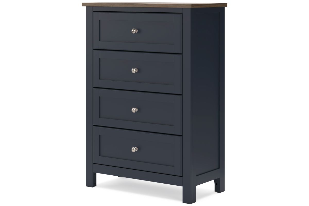 Add homespun charm to your restful retreat. A modern take on a timeless silhouette, this chest of drawers pairs a dark slate blue finish with a light brown top. Drawer fronts and legs in a classic Shaker style bring an air of beautiful simplicity to the bedroom. Whether it's part of a charmingly curated guest suite or a casually carefree kids room, this chest is a welcome addition.
