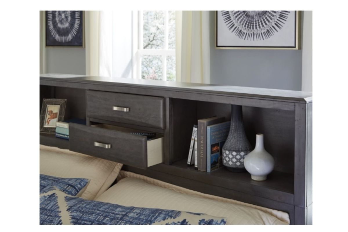 Contemporary style is shaping up beautifully. Designer elements are evident from every angle in this queen storage bed. Quality crafted with dovetail construction, contoured drawers solve small space problems with ease. On each side of the bed a deep drawer provides storage for everything from extra bedding and pillows, to seasonal clothes and more. Additional storage at the top and foot of the bed has you covered from head to toe.