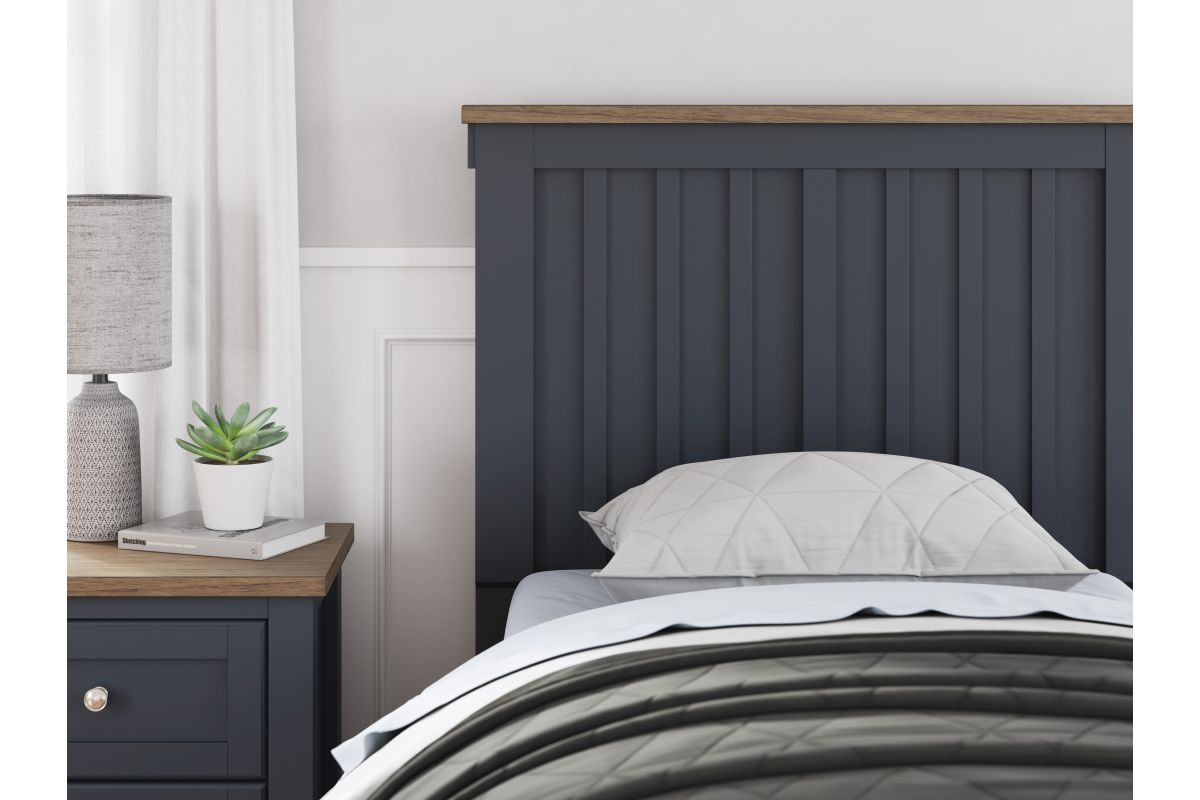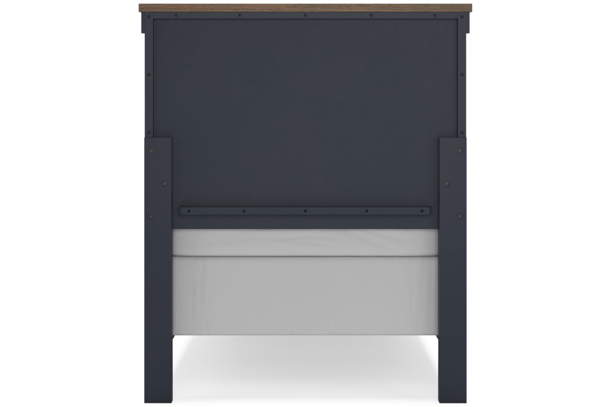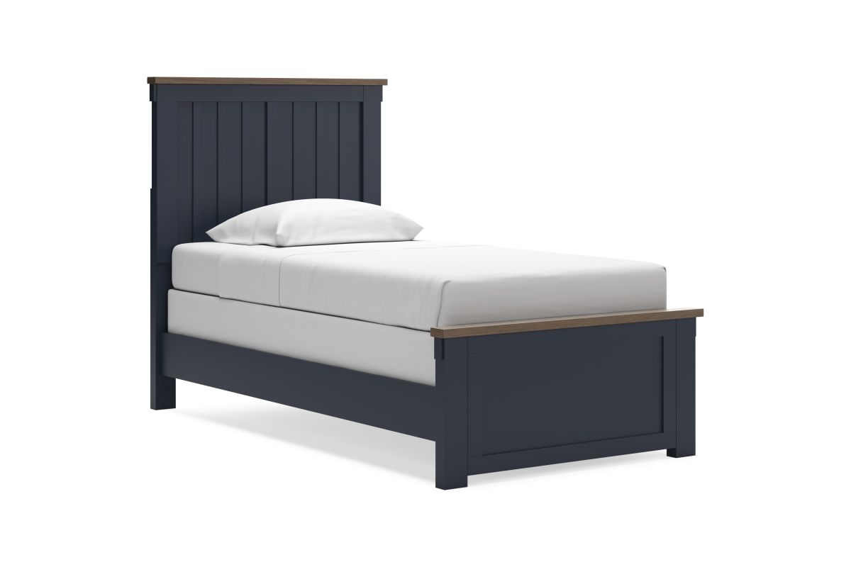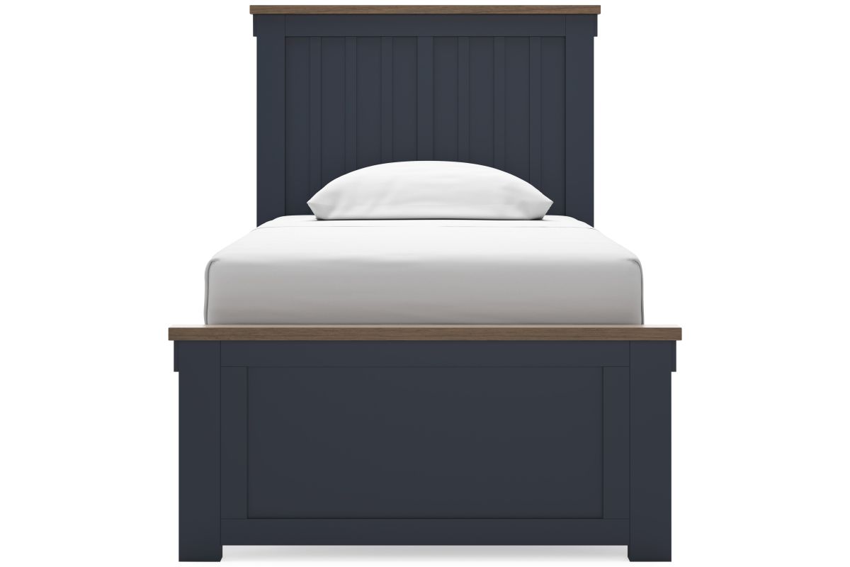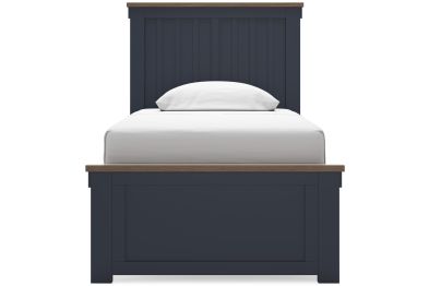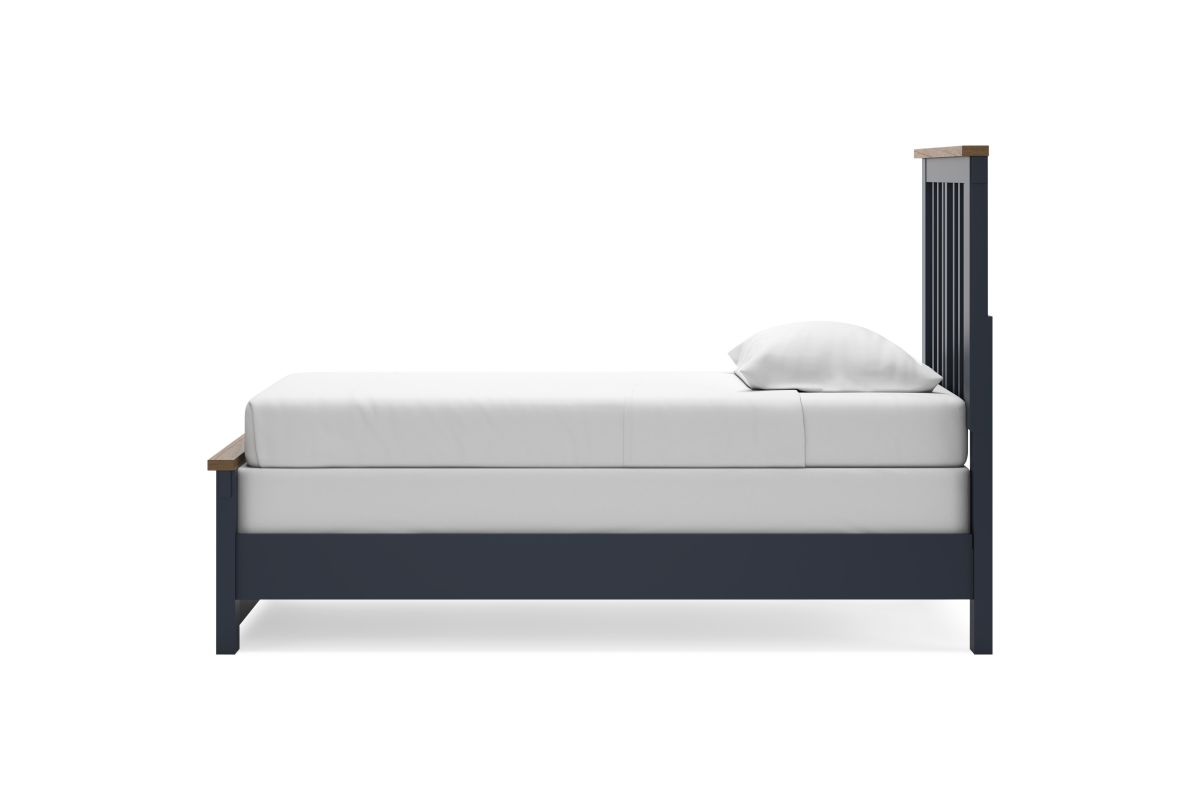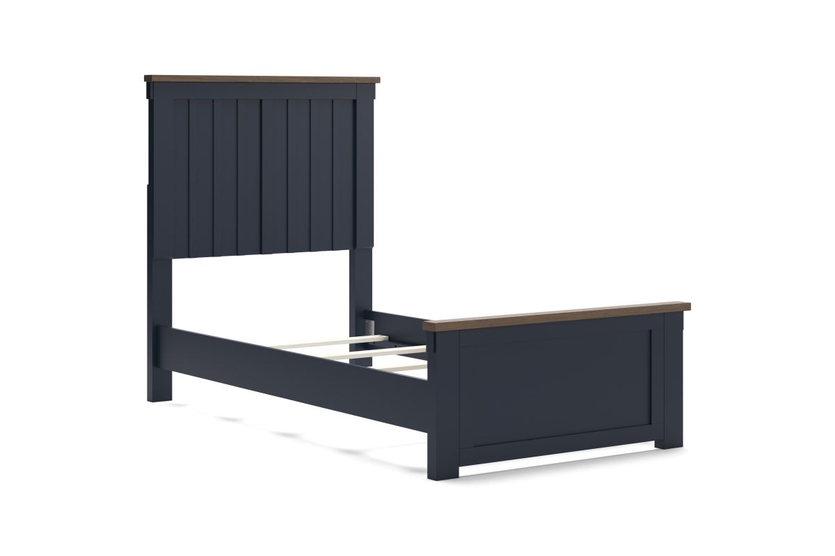 Add homespun charm to your restful retreat. A modern take on a timeless silhouette, this twin panel bed pairs a dark slate blue finish with light brown accents. The slatted headboard in a classic Shaker style brings an air of beautiful simplicity to the bedroom. Whether it's part of a charmingly curated guest suite or a casually carefree kid's room, this bed is a welcome addition.
