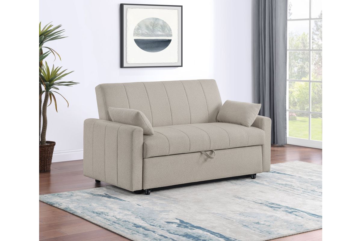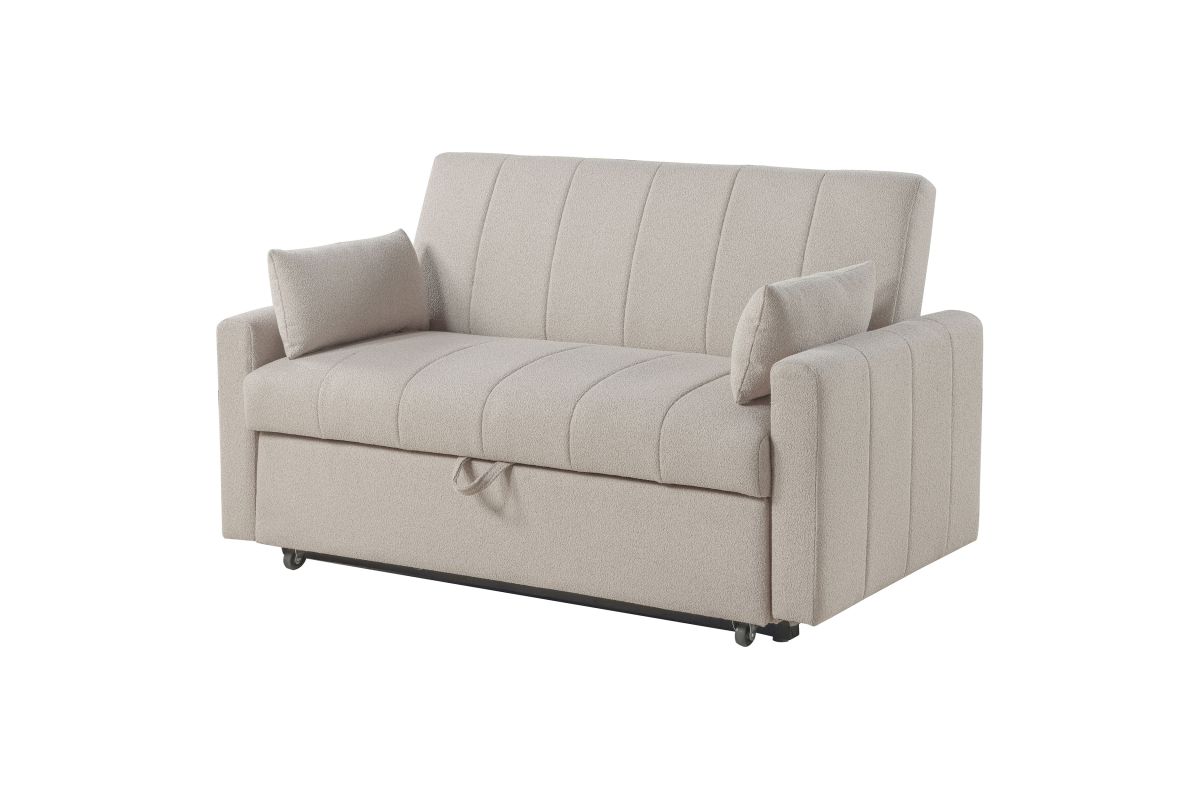 This modern sleeper sofa combines both style and function, featuring luxurious boucle fabric upholstery for a textured, inviting feel. Perfect for small spaces or multi-purpose rooms, the sofa showcases clean lines and vertical channel tufting, adding a contemporary touch to your home. Effortlessly transform it into a bed with a smooth pull-out mechanism, offering a comfortable sleeping area for overnight guests. The plush foam-filled cushions ensure maximum comfort, while built-in casters on the sleeper section make setup easy. With its versatile design and cozy boucle fabric, this sofa is a seamless addition to any living room or guest bedroom.
