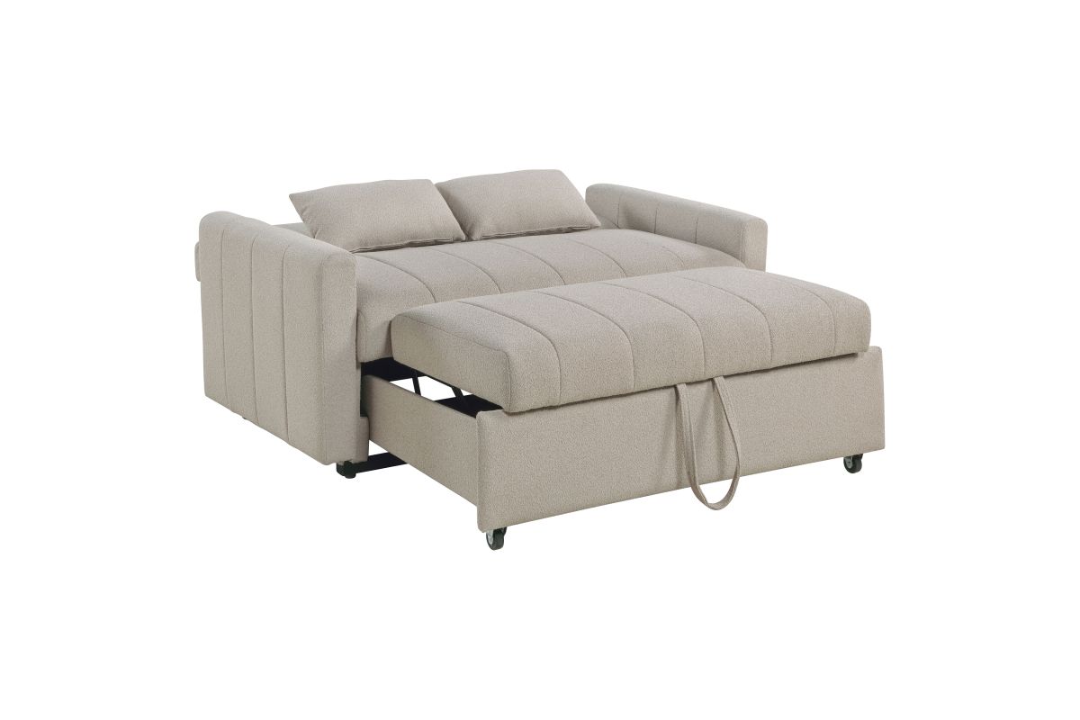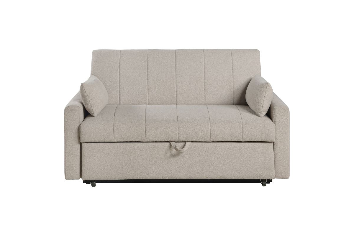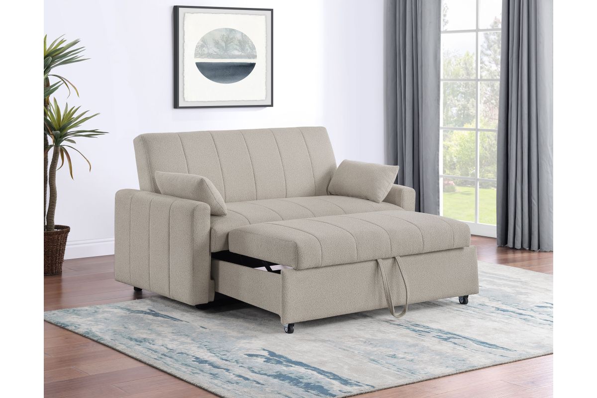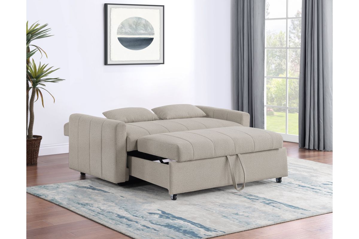 - Modern sleeper sofa upholstered in luxurious latte colored boucle fabric for a cozy, textured look