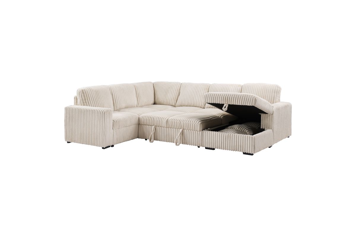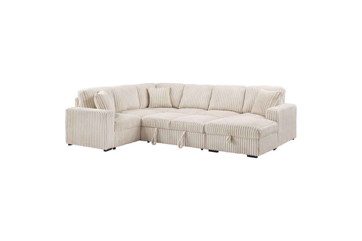 This versatile corduroy sleeper sectional effortlessly converts from cozy seating to a comfortable guest bed with its pop-up sleep surface. A spacious storage chaise keeps essentials at hand, while plush upholstery and three matching pillows provide lasting comfort and style. Its neutral tone complements any décor, making this piece an ideal centerpiece for relaxation, entertainment, and accommodating overnight guests. Built for durability, it seamlessly blends form, function, and modern appeal.