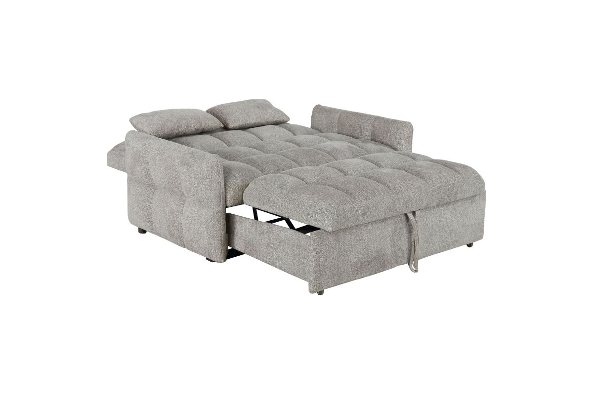 - Light grey sleeper sofa bed upholstered in soft chenille fabric with tufted design