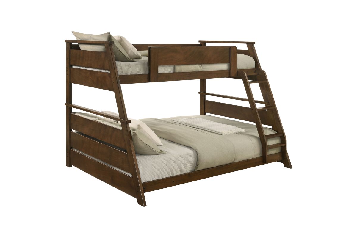 - Twin-over-full bunk bed with a warm walnut finish for a cozy, stylish appeal