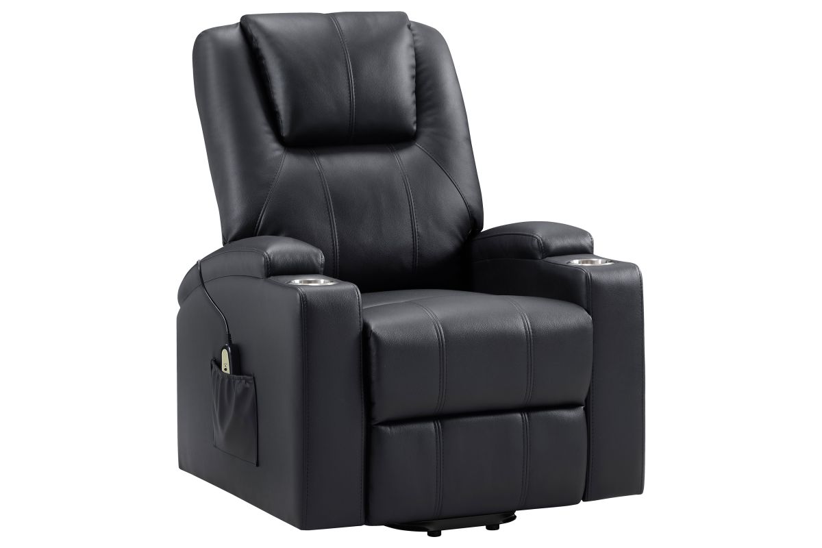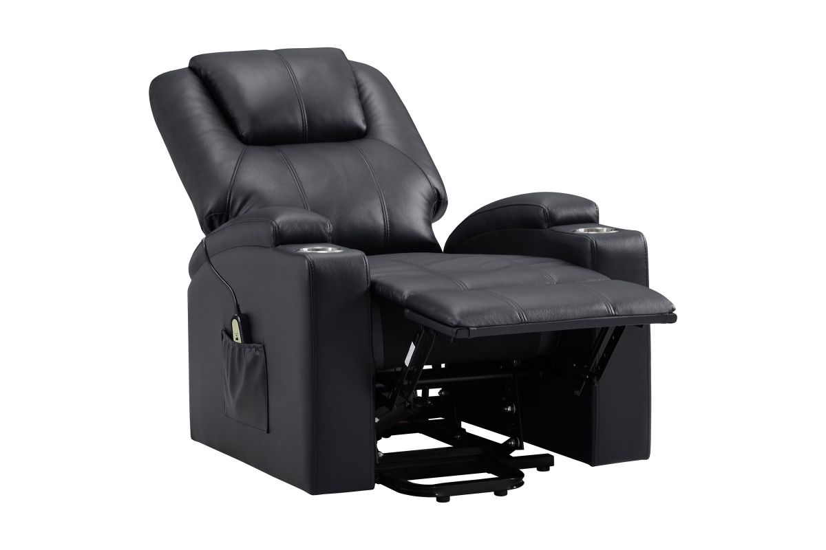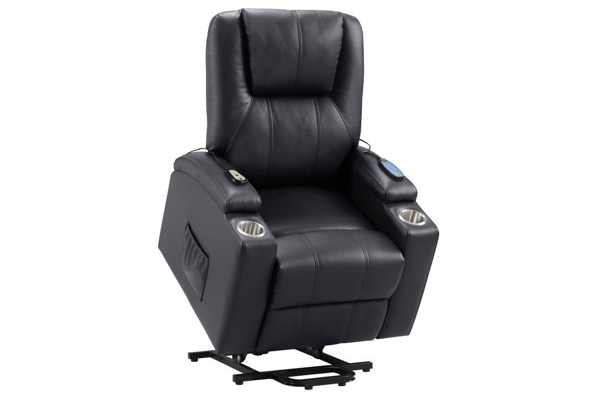 This power lift recliner delivers premium comfort and functionality, perfect for relaxing in style. The chair features luxurious faux leather upholstery and an ergonomic design to support your body at every angle. The power lift mechanism ensures easy movement in and out of the chair, offering assistance for standing or sitting with minimal effort. With integrated cup holders and side storage pockets, convenience is at your fingertips. The chair also includes massage and heat functions, allowing you to unwind and soothe your muscles after a long day. The wired remote control provides effortless operation of all features, from reclining to massage intensity.