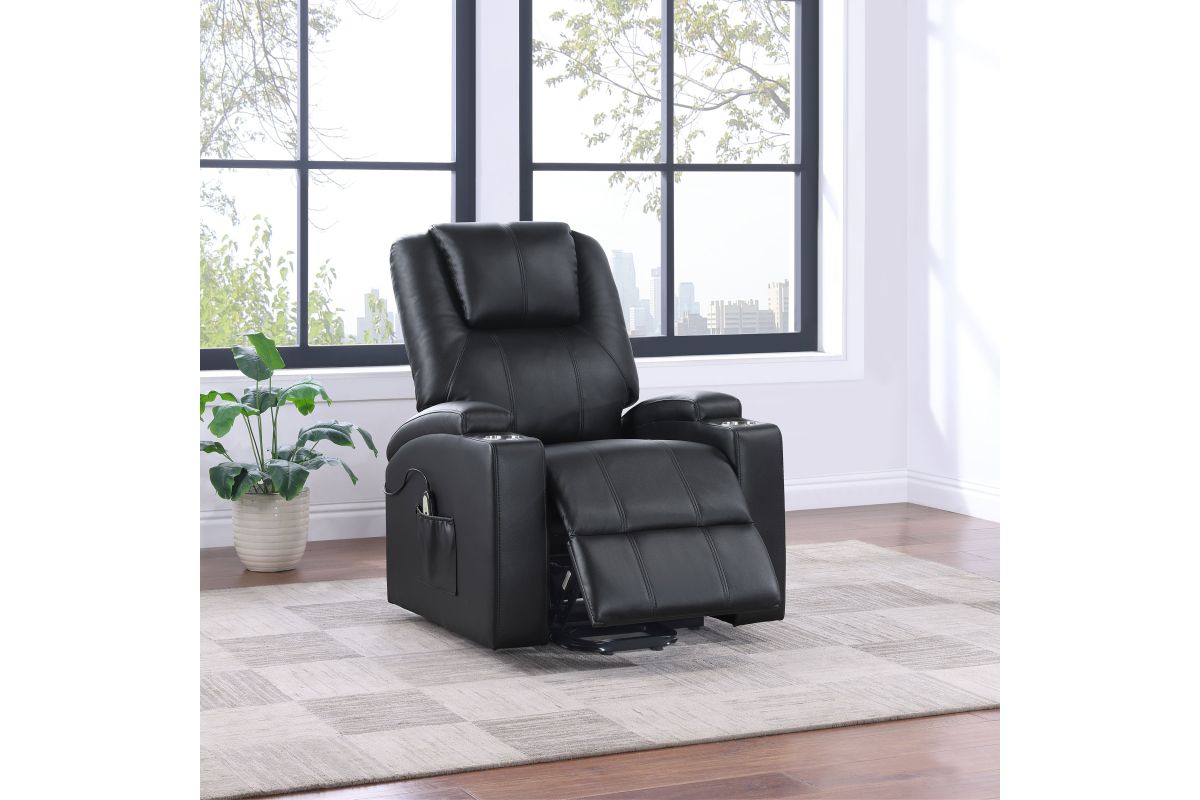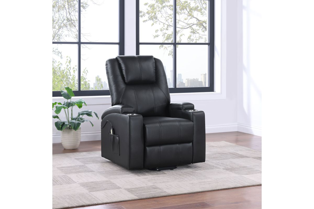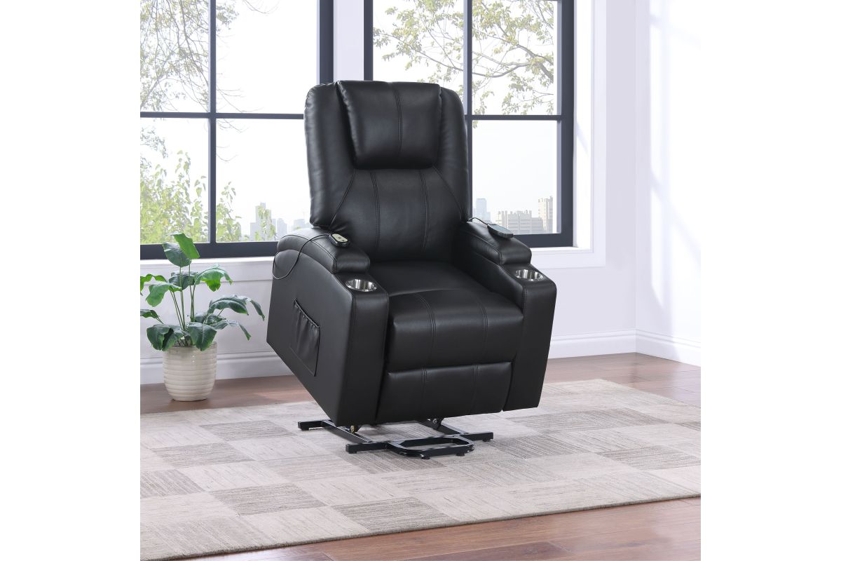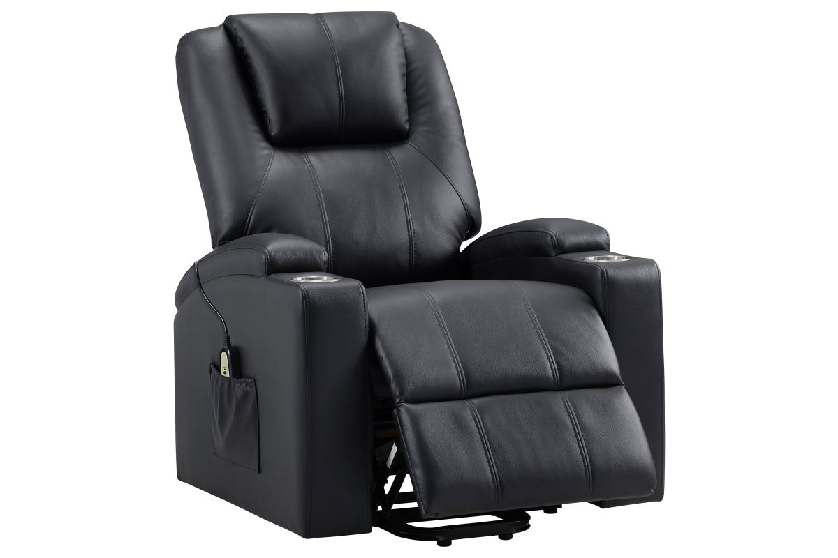 This power lift recliner delivers premium comfort and functionality, perfect for relaxing in style. The chair features luxurious faux leather upholstery and an ergonomic design to support your body at every angle. The power lift mechanism ensures easy movement in and out of the chair, offering assistance for standing or sitting with minimal effort. With integrated cup holders and side storage pockets, convenience is at your fingertips. The chair also includes massage and heat functions, allowing you to unwind and soothe your muscles after a long day. The wired remote control provides effortless operation of all features, from reclining to massage intensity.