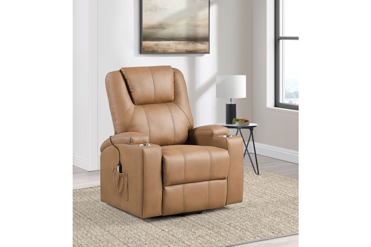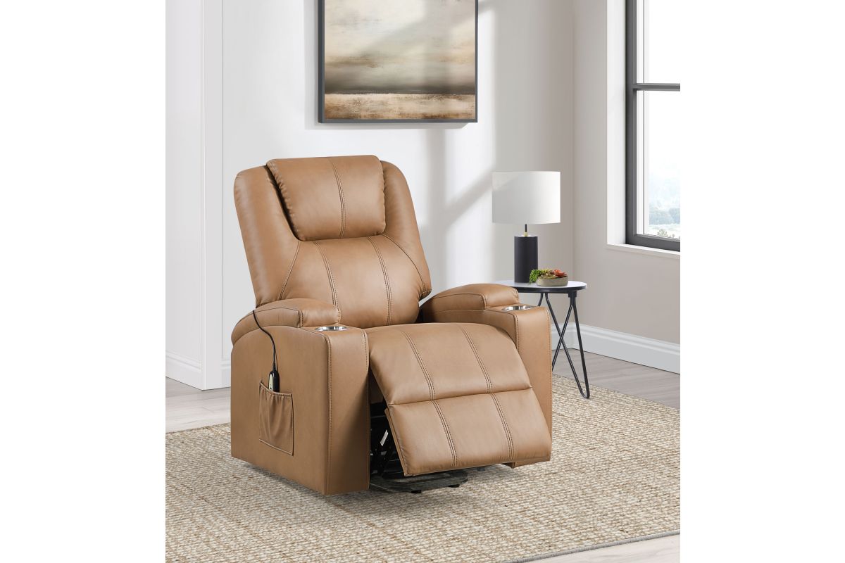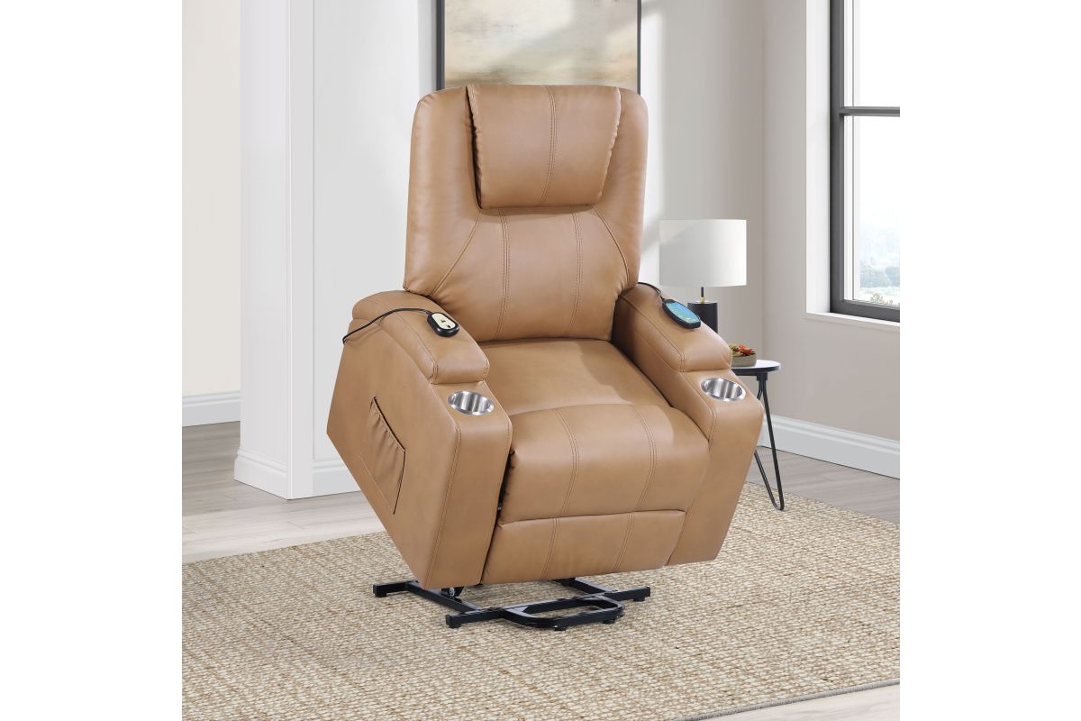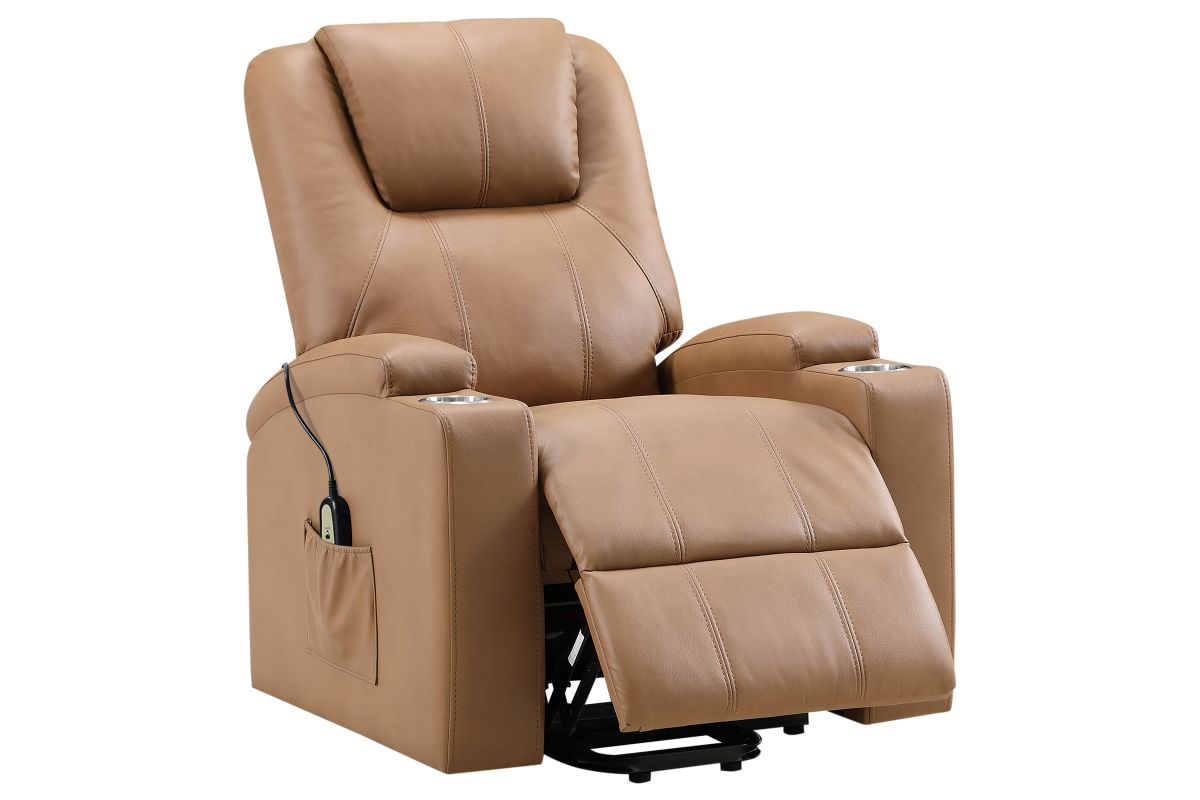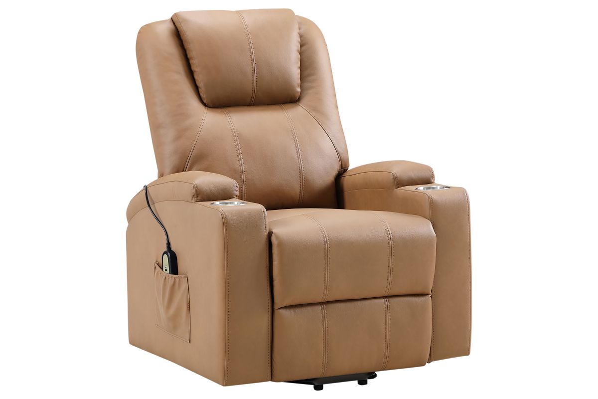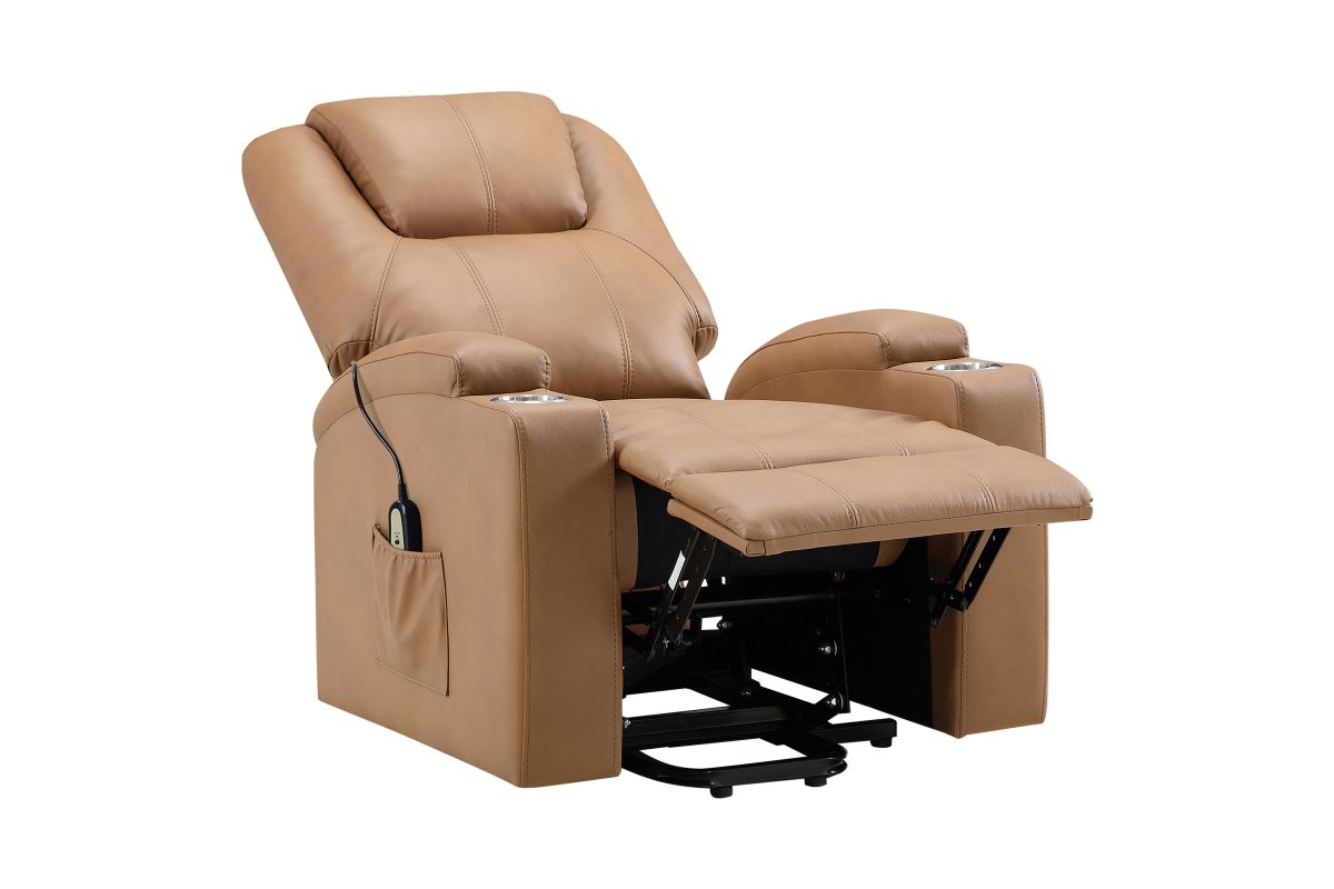 This power lift recliner delivers premium comfort and functionality, perfect for relaxing in style. The chair features luxurious faux leather upholstery and an ergonomic design to support your body at every angle. The power lift mechanism ensures easy movement in and out of the chair, offering assistance for standing or sitting with minimal effort. With integrated cup holders and side storage pockets, convenience is at your fingertips. The chair also includes massage and heat functions, allowing you to unwind and soothe your muscles after a long day. The wired remote control provides effortless operation of all features, from reclining to massage intensity.
