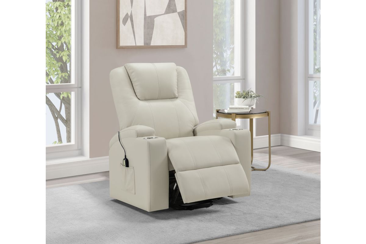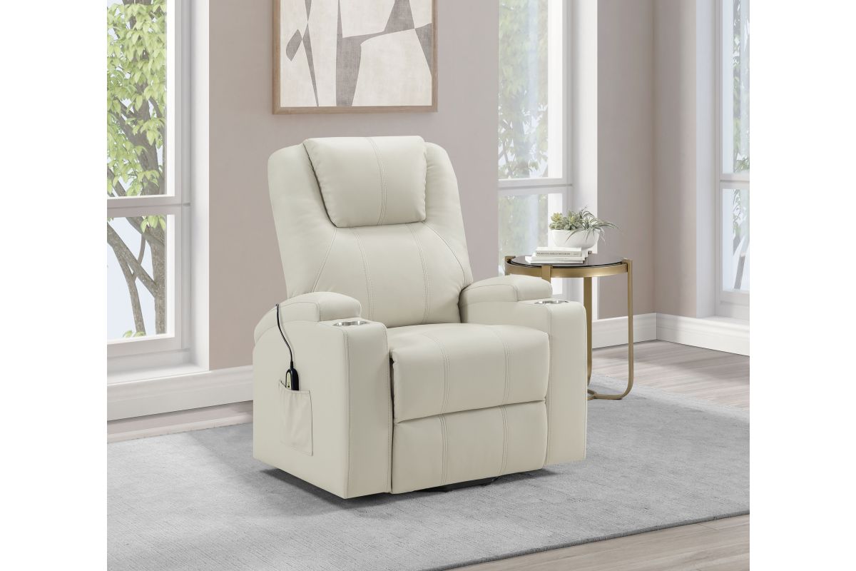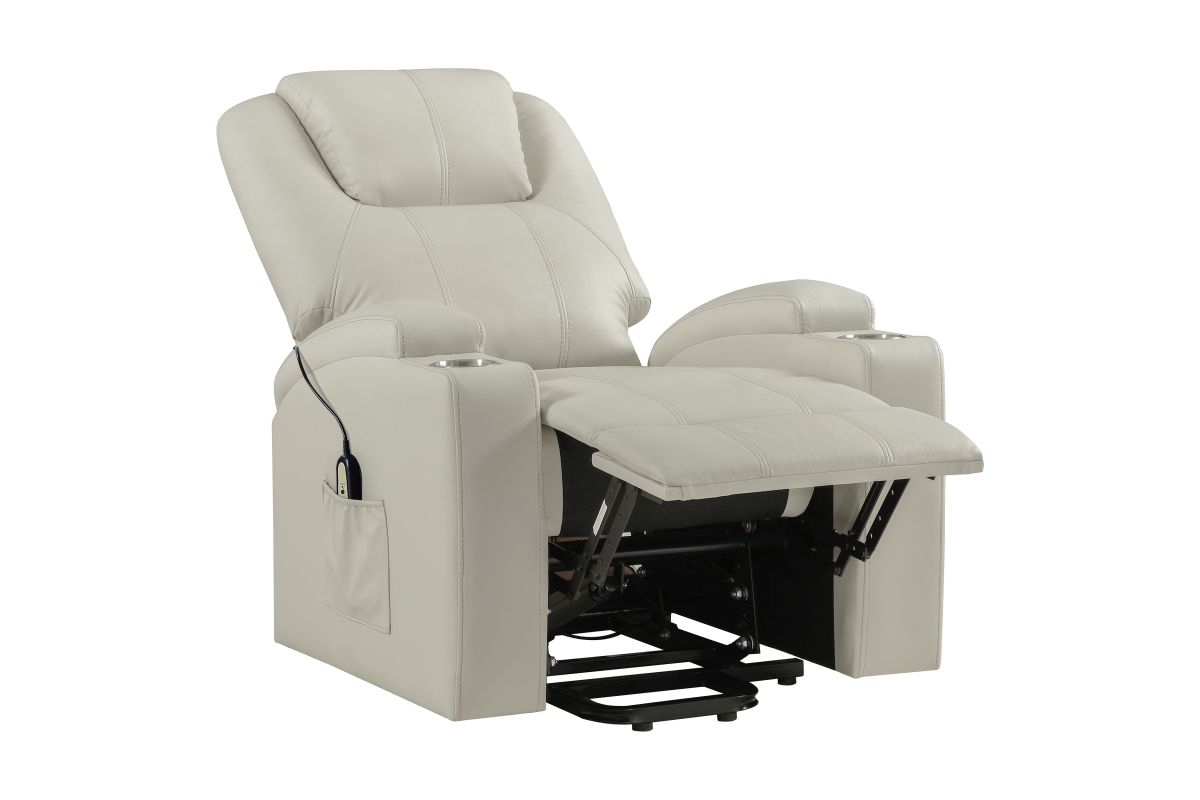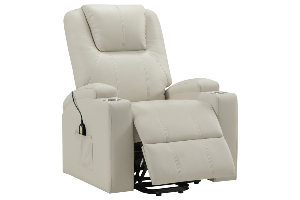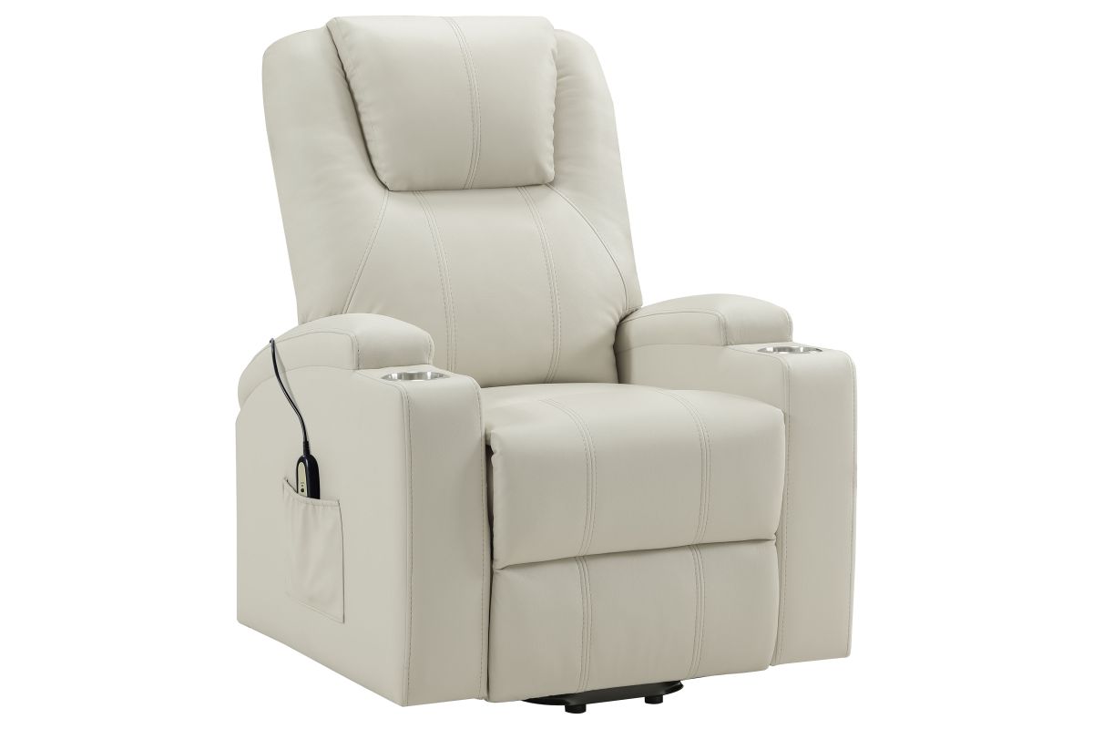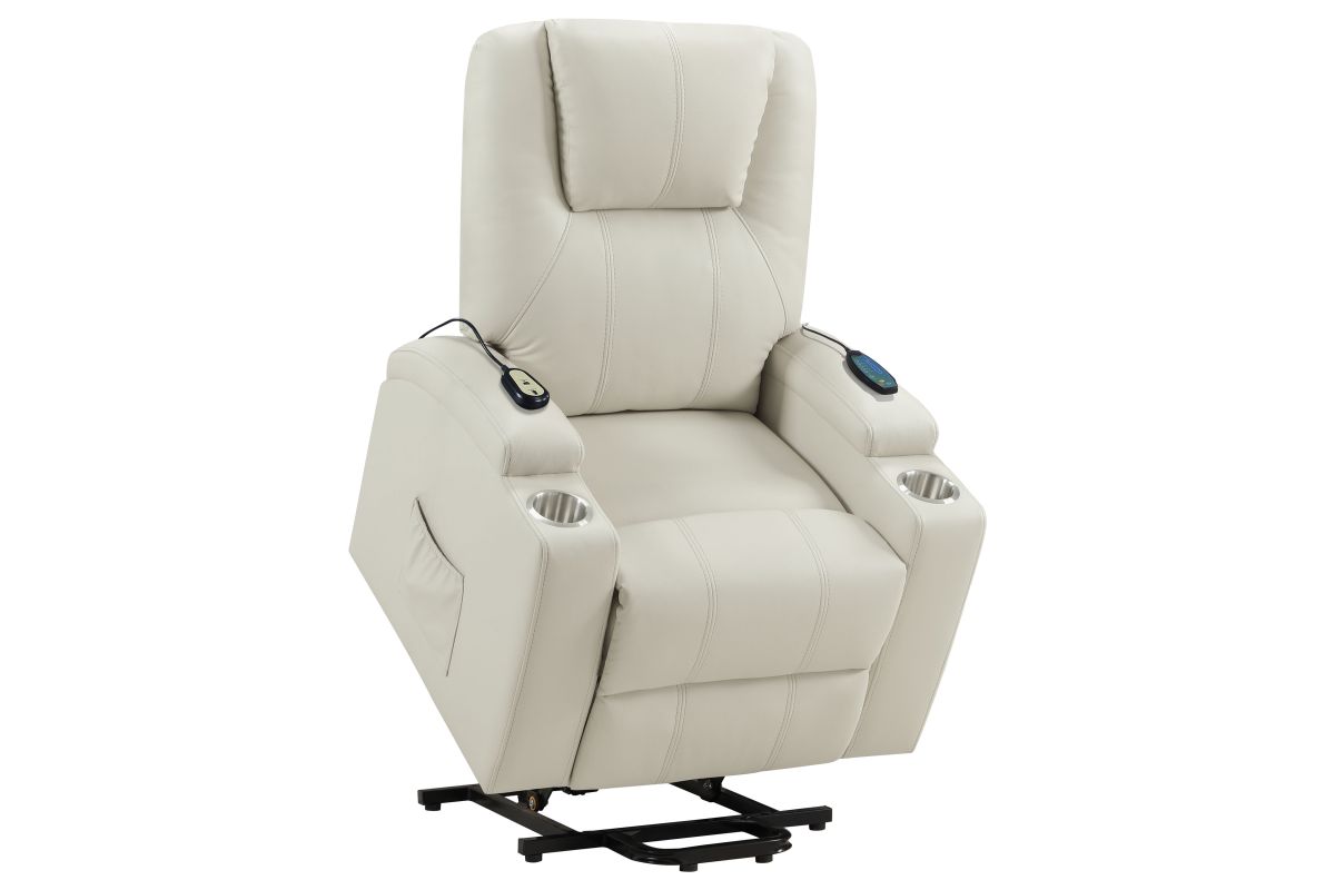 This power lift recliner delivers premium comfort and functionality, perfect for relaxing in style. The chair features luxurious faux leather upholstery and an ergonomic design to support your body at every angle. The power lift mechanism ensures easy movement in and out of the chair, offering assistance for standing or sitting with minimal effort. With integrated cup holders and side storage pockets, convenience is at your fingertips. The chair also includes massage and heat functions, allowing you to unwind and soothe your muscles after a long day. The wired remote control provides effortless operation of all features, from reclining to massage intensity.