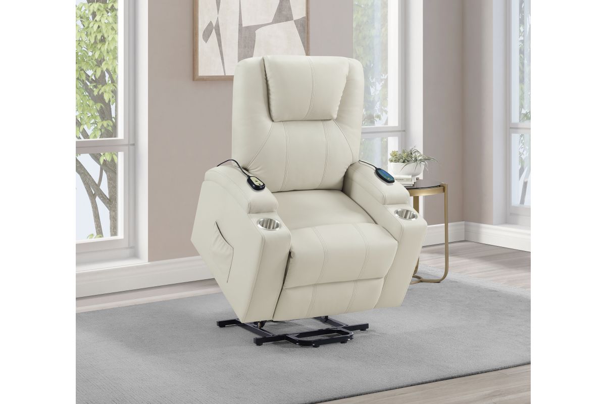 - Power lift recliner with heat and massage functions offers comfort and support with ergonomic contouring