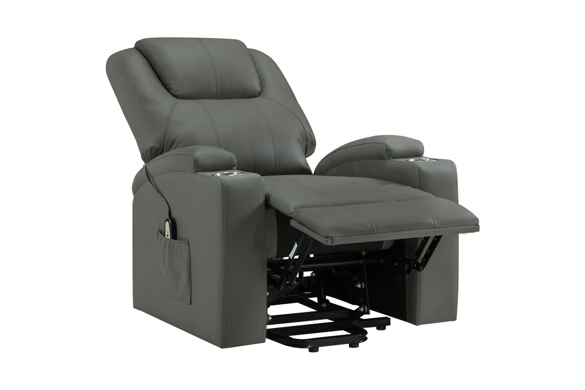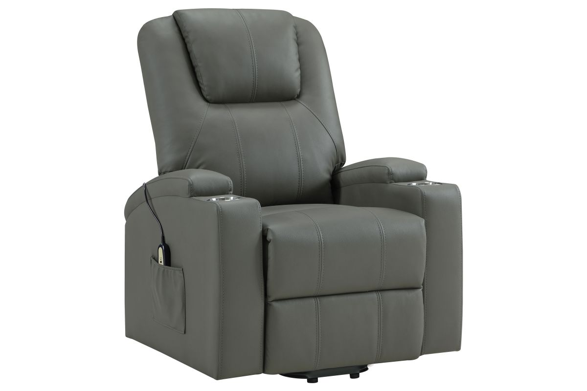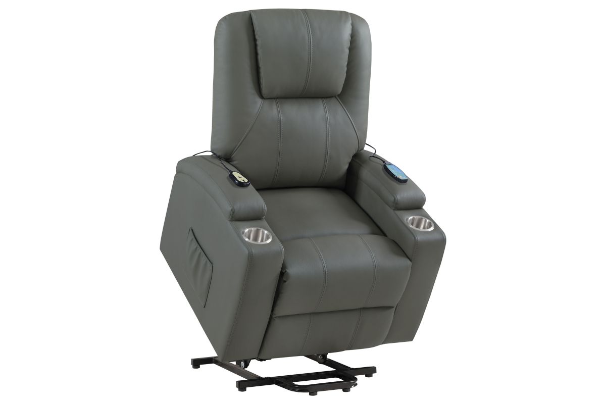 This power lift recliner delivers premium comfort and functionality, perfect for relaxing in style. The chair features luxurious faux leather upholstery and an ergonomic design to support your body at every angle. The power lift mechanism ensures easy movement in and out of the chair, offering assistance for standing or sitting with minimal effort. With integrated cup holders and side storage pockets, convenience is at your fingertips. The chair also includes massage and heat functions, allowing you to unwind and soothe your muscles after a long day. The wired remote control provides effortless operation of all features, from reclining to massage intensity.