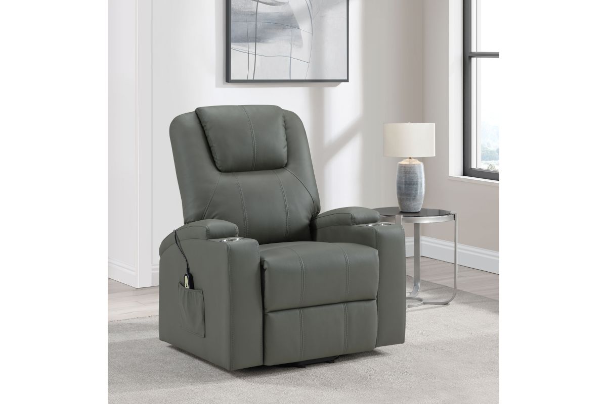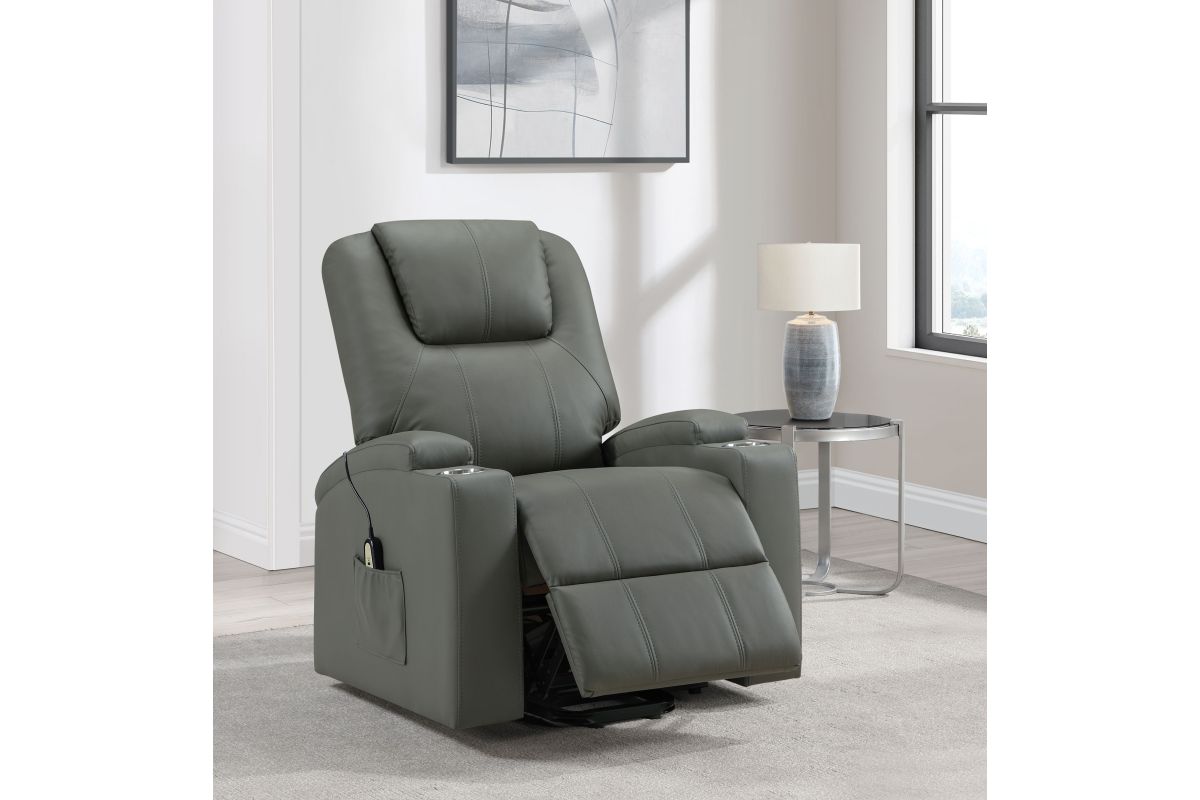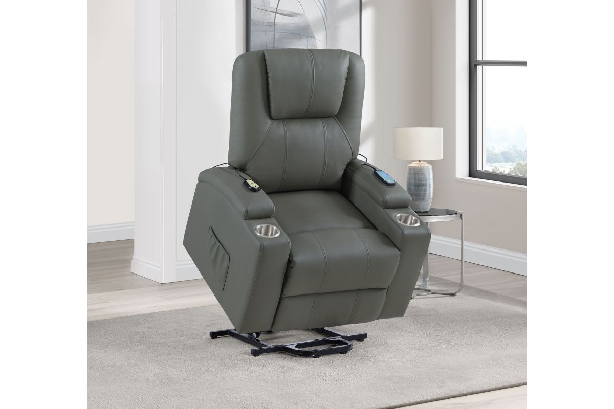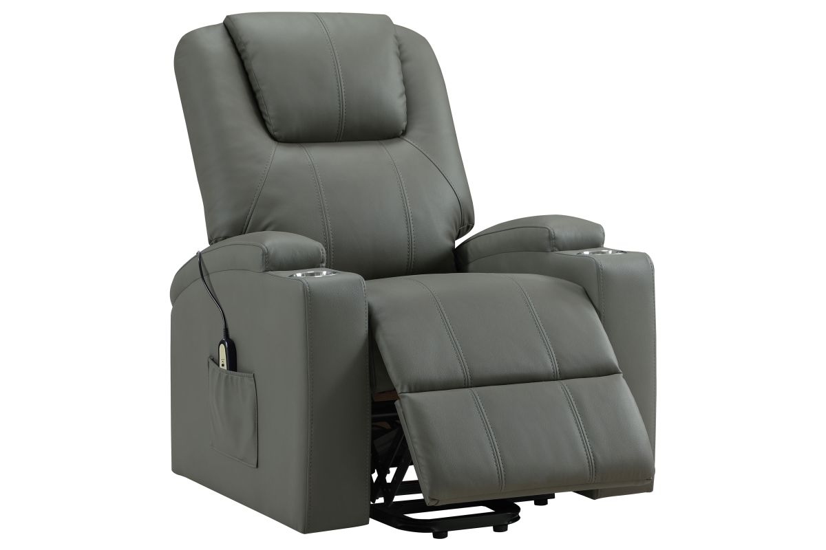 This power lift recliner delivers premium comfort and functionality, perfect for relaxing in style. The chair features luxurious faux leather upholstery and an ergonomic design to support your body at every angle. The power lift mechanism ensures easy movement in and out of the chair, offering assistance for standing or sitting with minimal effort. With integrated cup holders and side storage pockets, convenience is at your fingertips. The chair also includes massage and heat functions, allowing you to unwind and soothe your muscles after a long day. The wired remote control provides effortless operation of all features, from reclining to massage intensity.