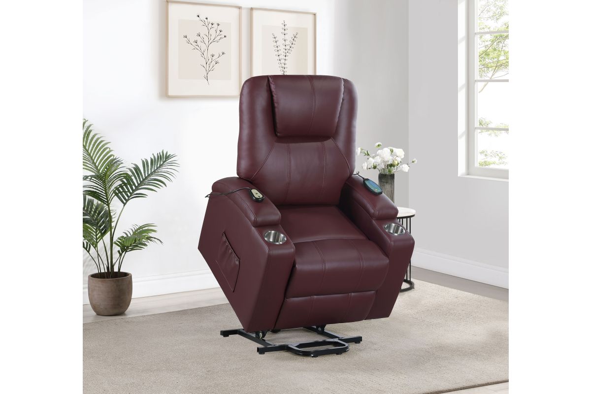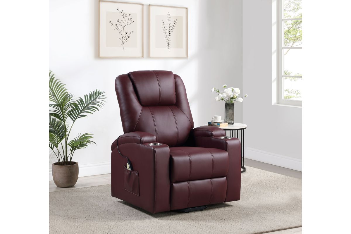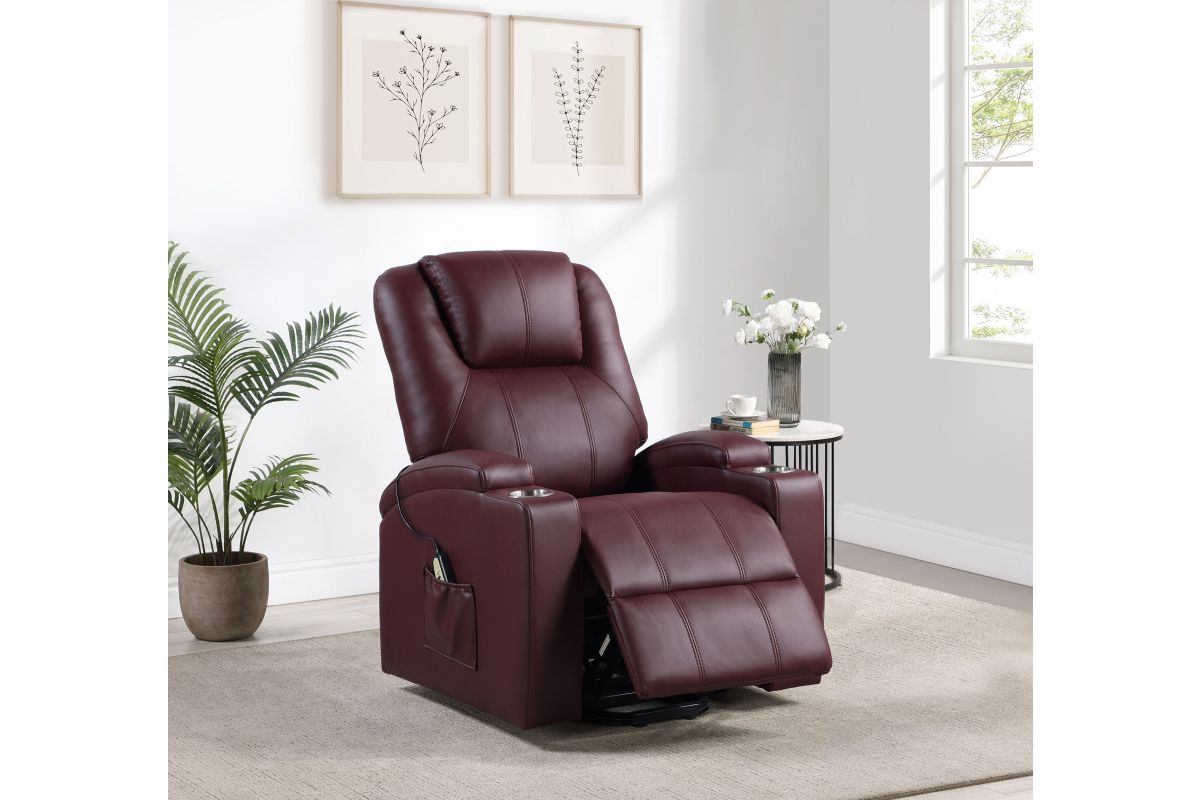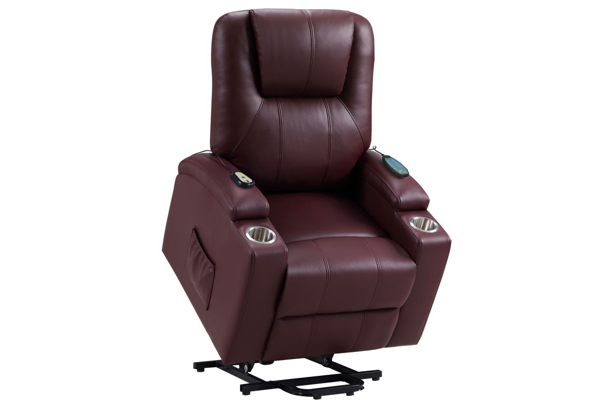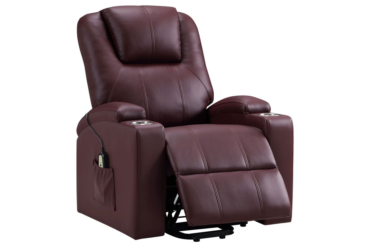 This power lift recliner delivers premium comfort and functionality, perfect for relaxing in style. The chair features luxurious faux leather upholstery and an ergonomic design to support your body at every angle. The power lift mechanism ensures easy movement in and out of the chair, offering assistance for standing or sitting with minimal effort. With integrated cup holders and side storage pockets, convenience is at your fingertips. The chair also includes massage and heat functions, allowing you to unwind and soothe your muscles after a long day. The wired remote control provides effortless operation of all features, from reclining to massage intensity.
