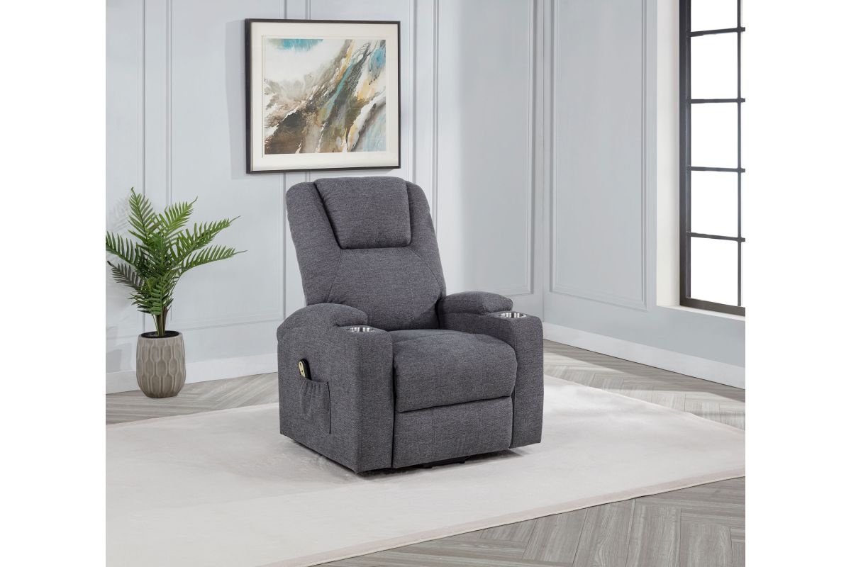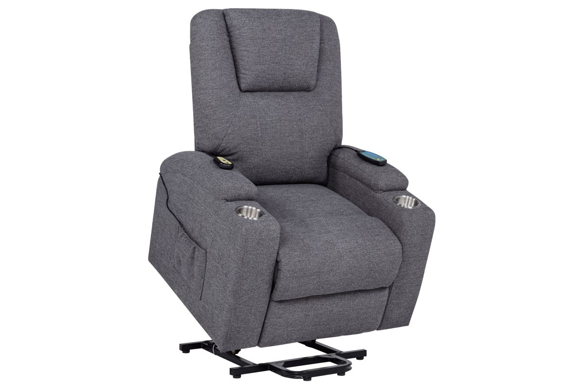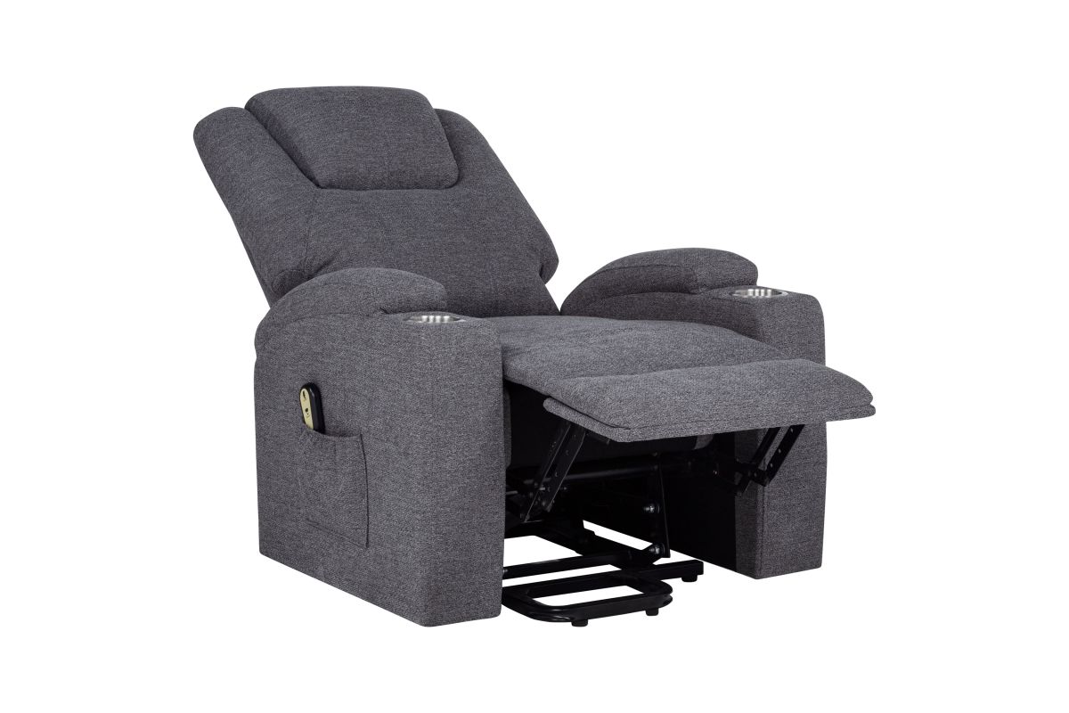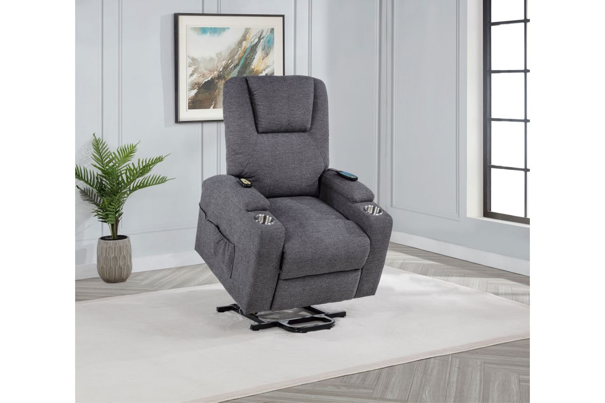 - Power lift massage chair in dark grey chenille offers wired remote-controlled recline and lift