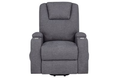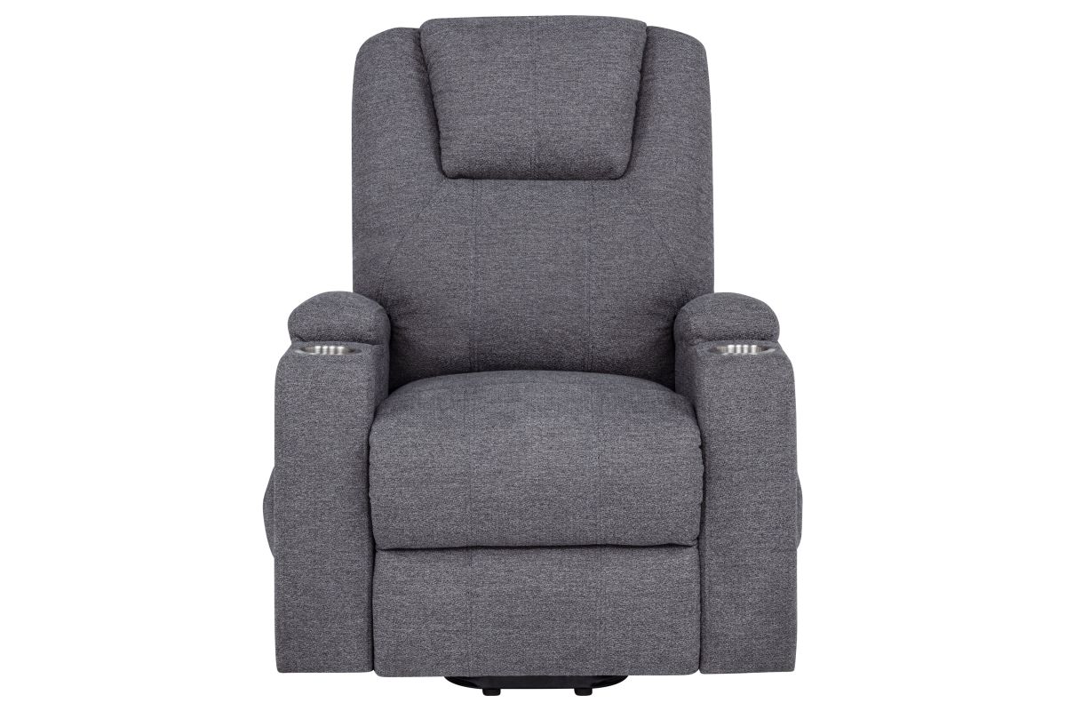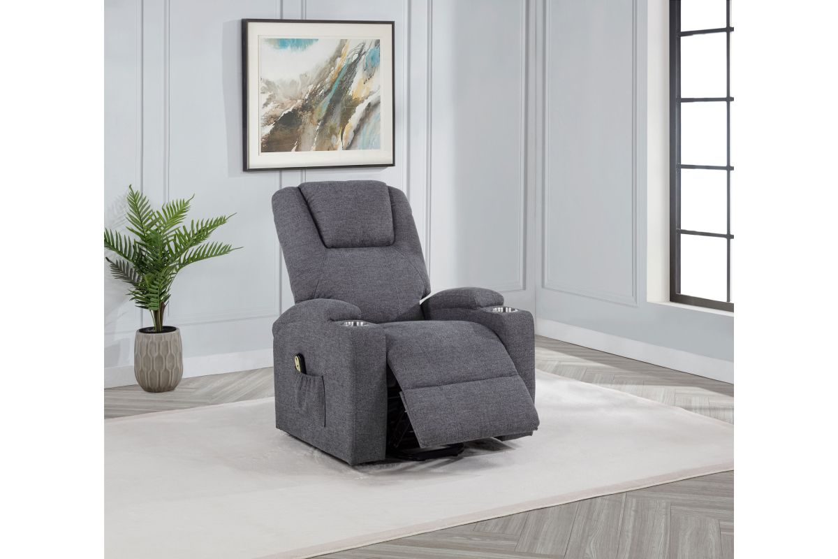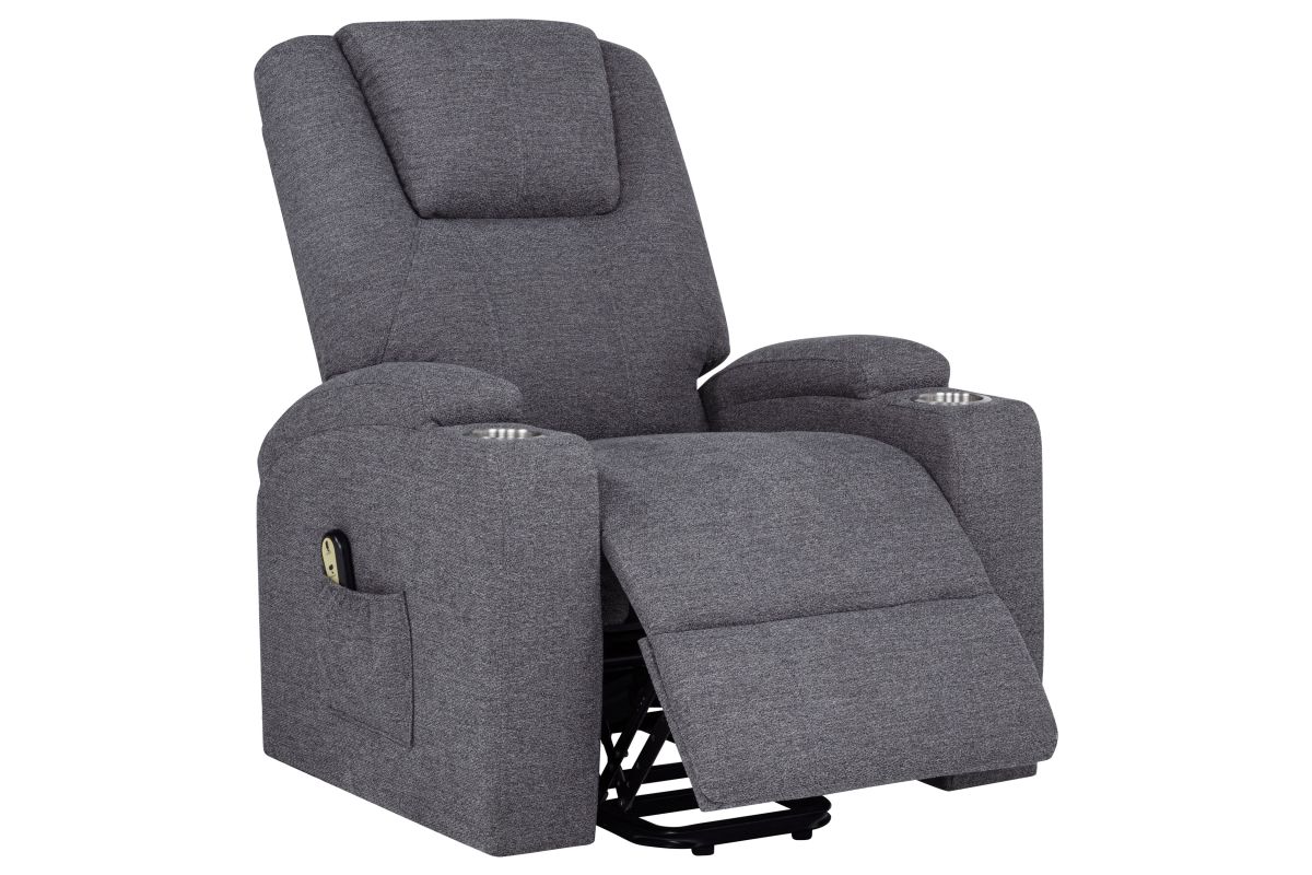 - Power lift massage chair in dark grey chenille offers wired remote-controlled recline and lift