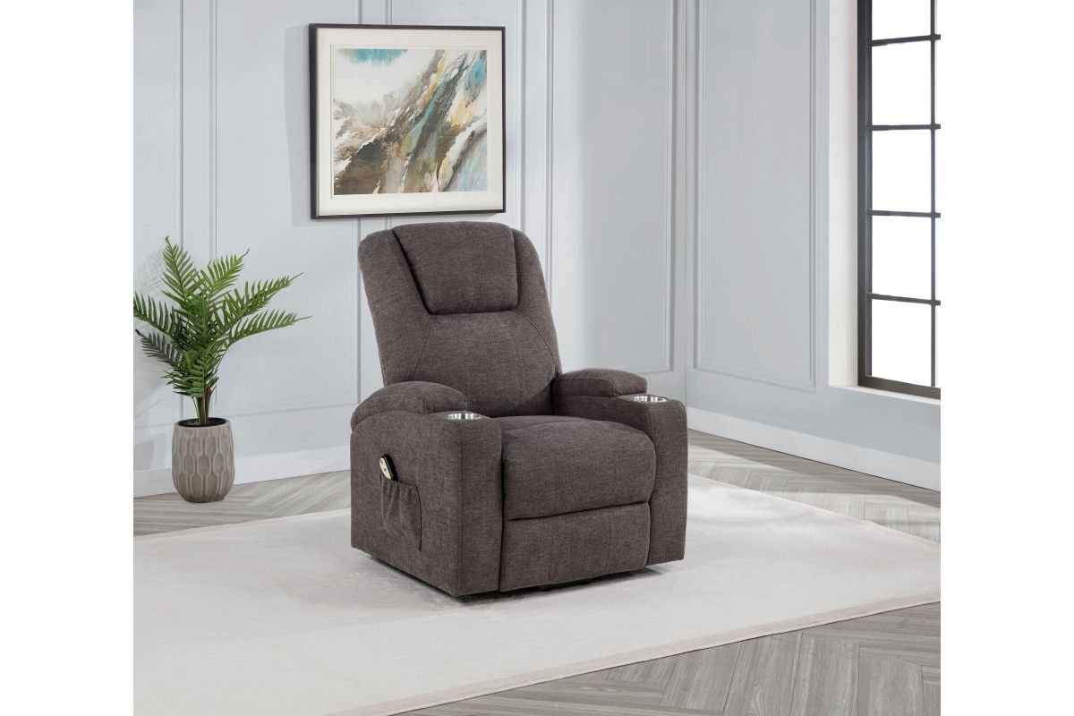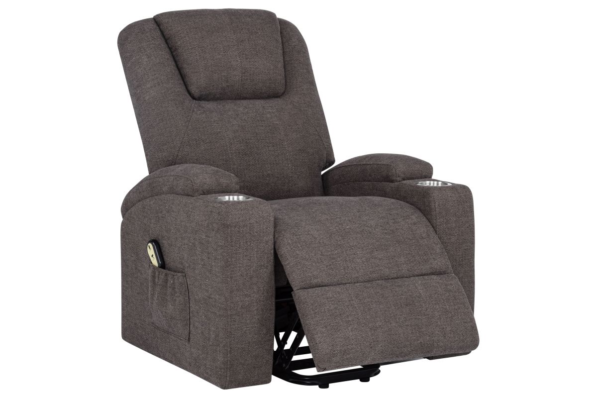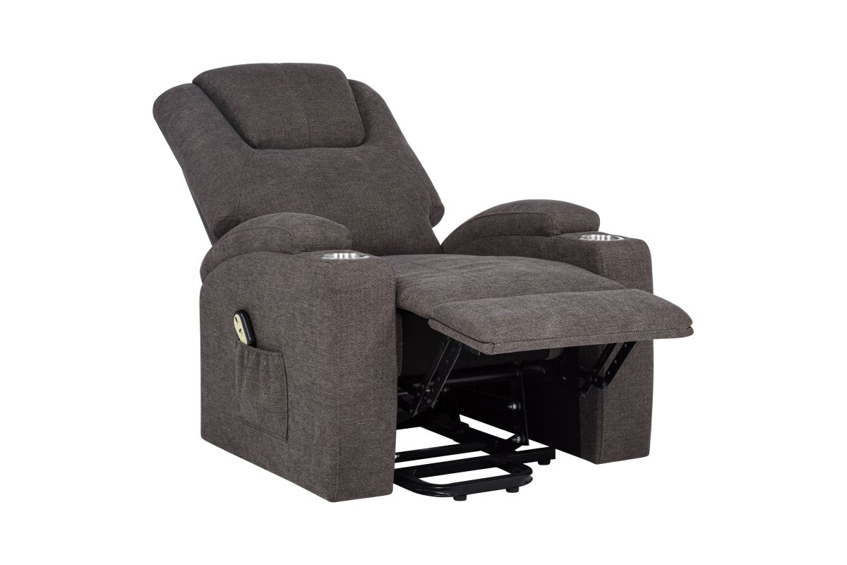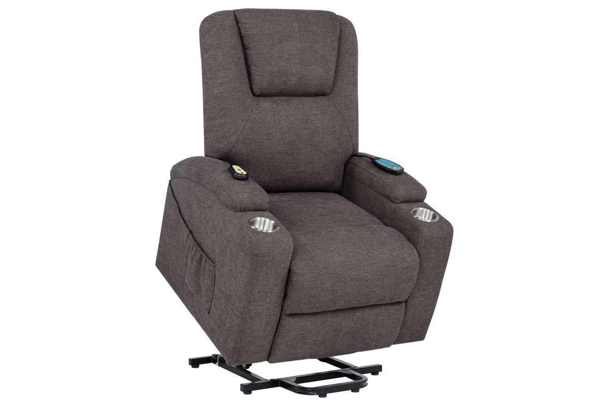- Power lift massage chair in brown chenille offers wired remote-controlled recline and lift