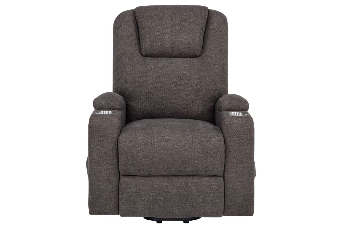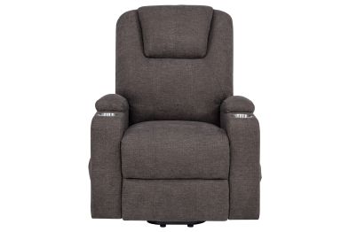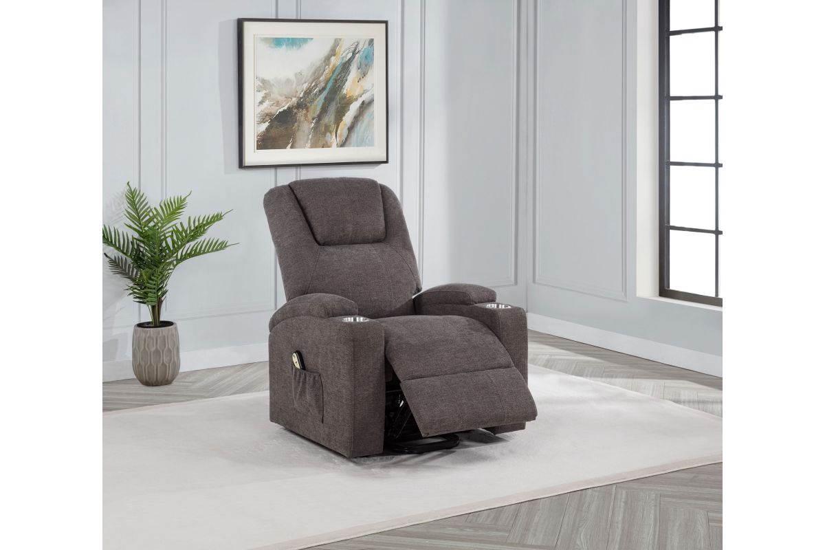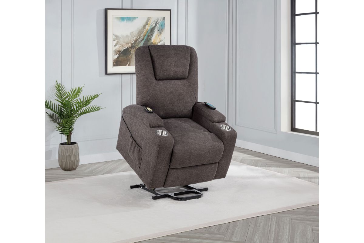 - Power lift massage chair in brown chenille offers wired remote-controlled recline and lift