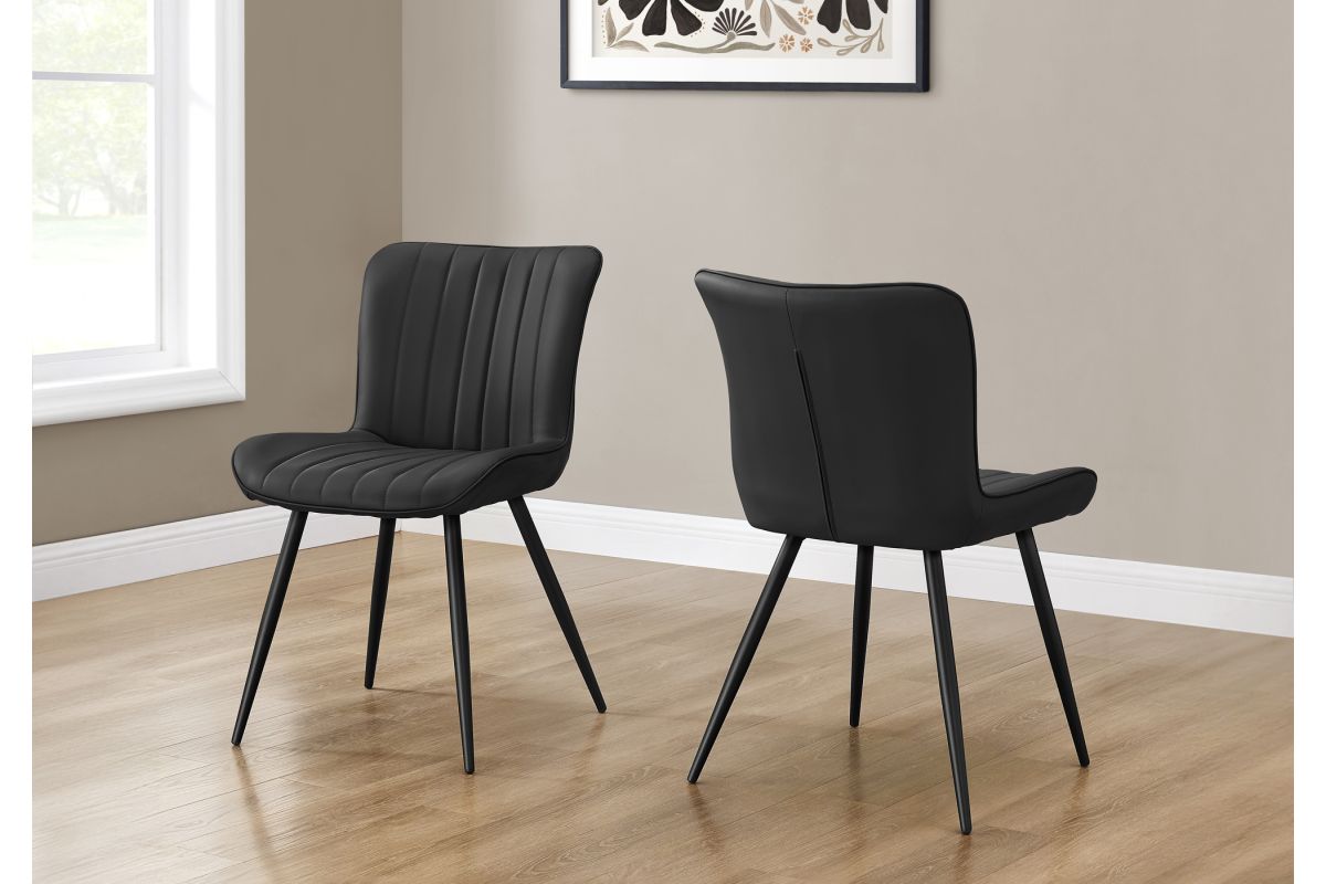 Transform your dining space with this mid-century inspired set of 2 dining chairs, perfect for entertaining or casual family dining. Standing at a stylish 33" height, these chairs are upholstered in a channel designed, soft black leather-look fabric that seamlessly blends with contemporary kitchens and dining rooms. Fashionable style meets unmatched comfort with padded foam cushioning along the curved back and supportive seats with sturdy angled black metal legs, for a modern industrial aesthetic. The durable design coupled with sturdy construction ensures that these comfortable chairs are not only reliable but easy to clean with a simple swipe of a soft cloth. These side chairs include illustrated instructions for a quick and easy to assemble, allowing you to set up your dining space with minimal effort. For a worry-free purchase, a 2-year limited warranty against any defects is included to ensure your satisfaction and peace of mind. Discover the blend of style, comfort, and durability with these versatile and sleek black leather-look dining chairs.