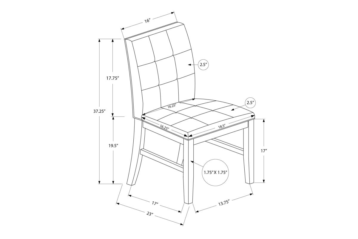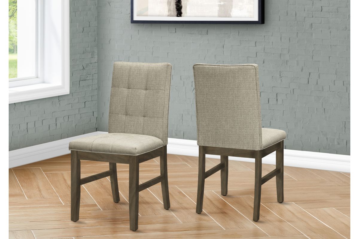 Experience extraordinary comfort and fashionable style with this set of 2 transitional style dining chairs! At 37" high, these chairs are upholstered in a tufted brown fabric over thick foam cushioning, with a grey solid wood frame, perfect in a formal or casual family dining room or kitchen. The transitional design and sturdy construction brings a sense of class and sophistication to any dining space without sacrificing quality. Easy to assemble with full illustrated instructions included, these durable dining chairs with a padded solid back come with a 2 year limited warranty for your satisfaction and confidence. Pair it with a matching dining table (sold separately) for a truly luxurious and comfortable look in your dining area.