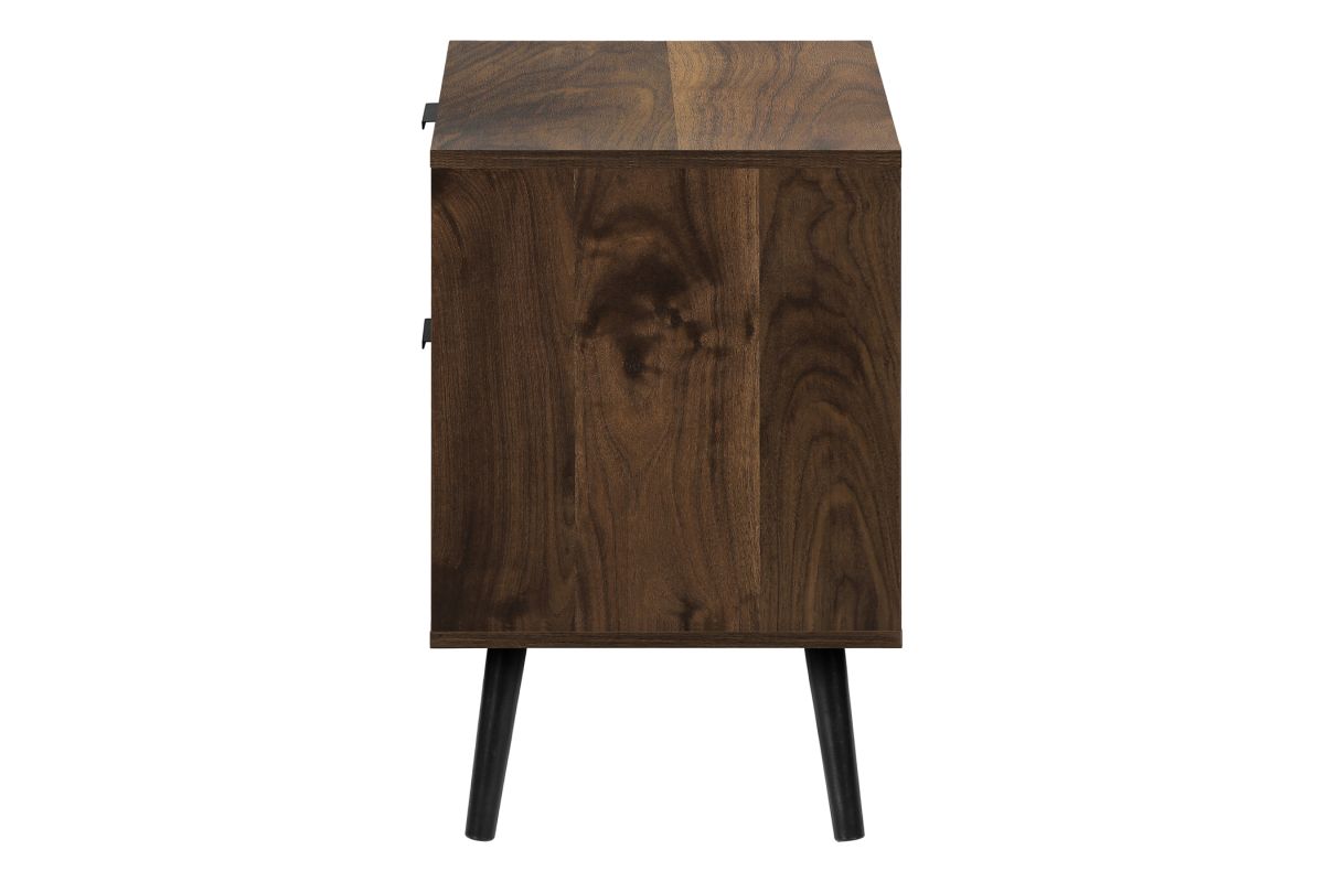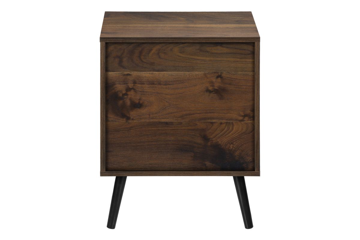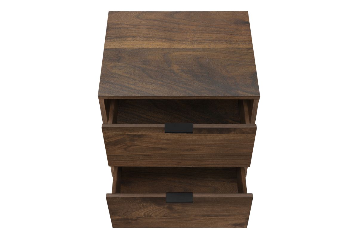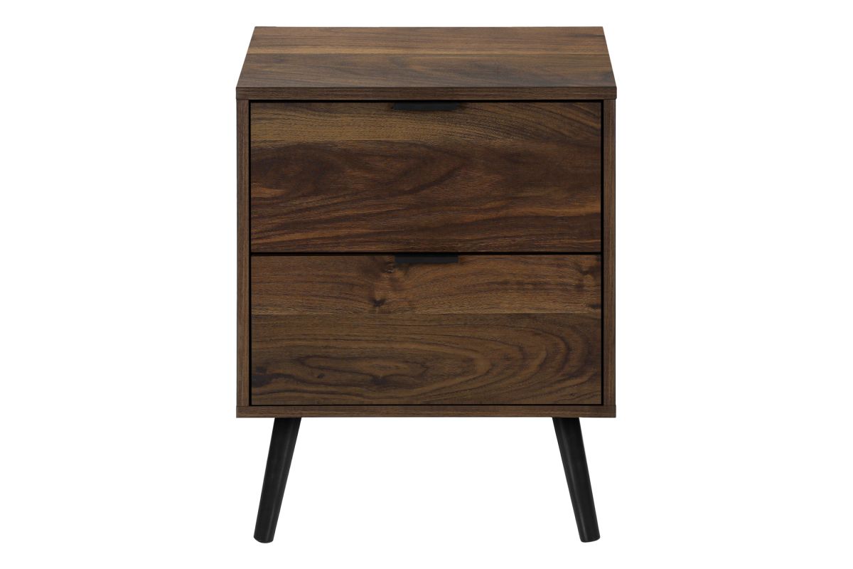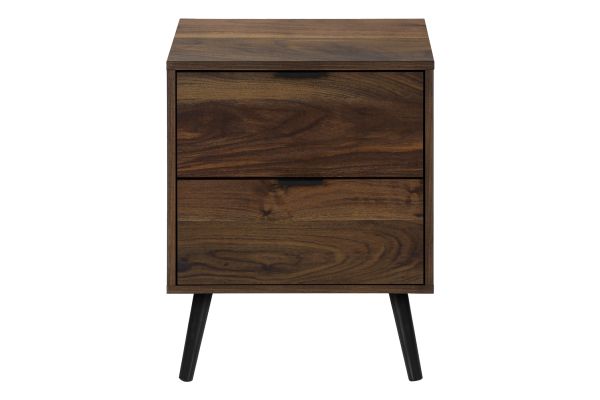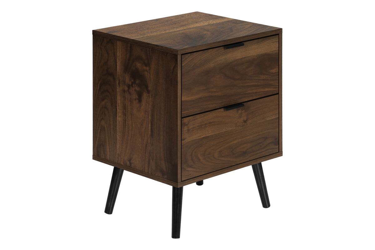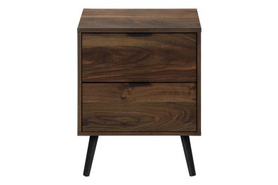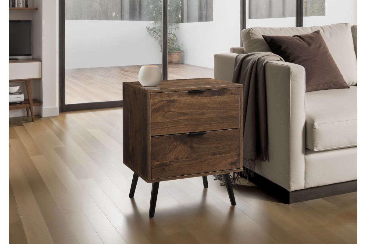 Transform your living room or bedroom into a chic haven with our stunning 24"h accent table, designed to complement modern lifestyles with fashionable style and practicality. Crafted with durable walnut laminate on all sides, this contemporary end table showcases a beautiful wood-look finish that adds warmth and sophistication to any space. Equipped with two spacious storage drawers and accented with black metal handles, this table is perfect for keeping your essentials neatly tucked away, making it an ideal nightstand or side table. The black solid wood legs ensure a sturdy and stable structure that supports your daily needs while maintaining a sleek profile. Durably designed with its space saving design, this accent table is also easy to assemble with the step by step illustrated instructions included. No need to worry about maintenance, the easy to clean top makes tidying up a breeze, ensuring your table looks fabulous and fresh for years to come. With our 5 year limited warranty against manufacturer defects, you can enjoy peace of mind knowing you've made a smart investment in quality.