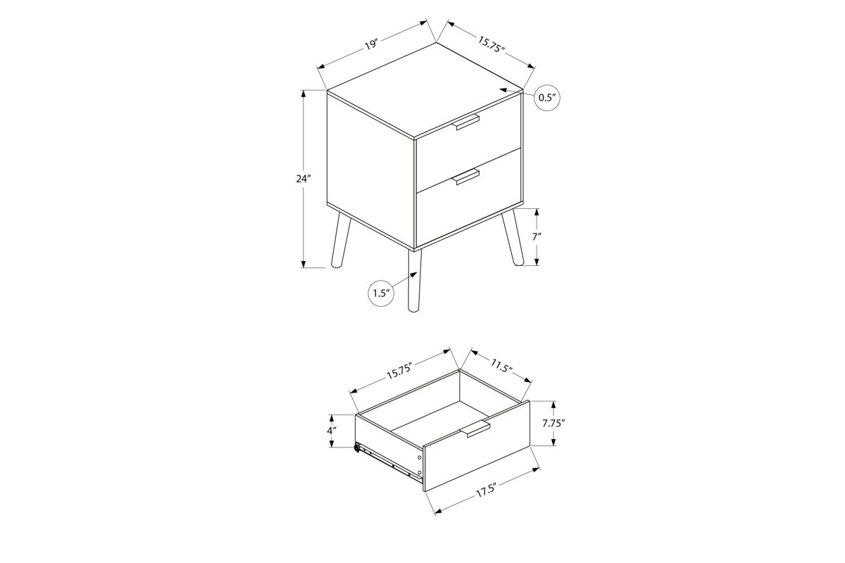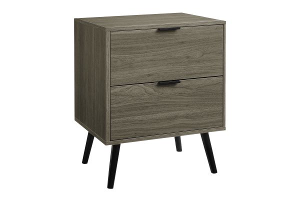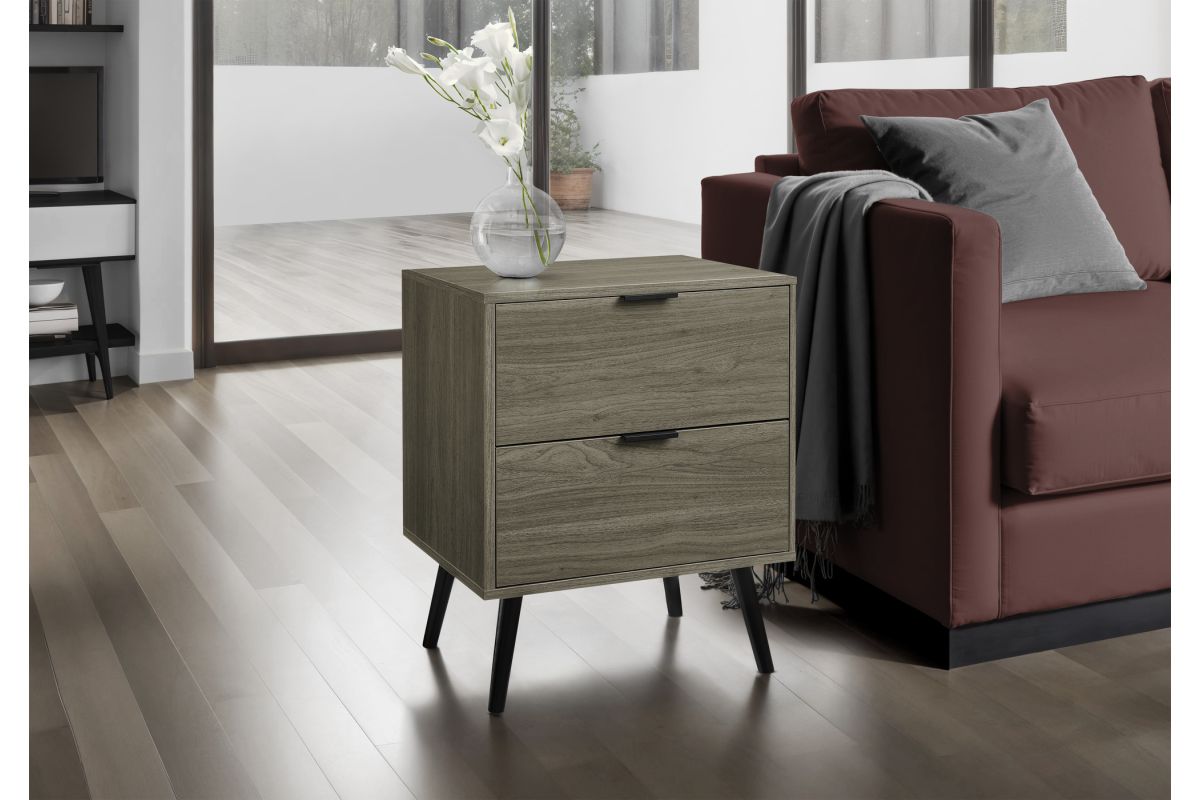 Transform your living room or bedroom into a chic haven with our stunning 24"h accent table, designed to complement modern lifestyles with fashionable style and practicality. Crafted with durable grey laminate on all sides, this contemporary end table showcases a beautiful wood-look finish that adds warmth and sophistication to any space. Equipped with two spacious storage drawers and accented with black metal handles, this table is perfect for keeping your essentials neatly tucked away, making it an ideal nightstand or side table. The black solid wood legs ensure a sturdy and stable structure that supports your daily needs while maintaining a sleek profile. Durably designed with its space saving design, this accent table is also easy to assemble with the step by step illustrated instructions included. No need to worry about maintenance, the easy to clean top makes tidying up a breeze, ensuring your table looks fabulous and fresh for years to come. With our 5 year limited warranty against manufacturer defects, you can enjoy peace of mind knowing you've made a smart investment in quality.