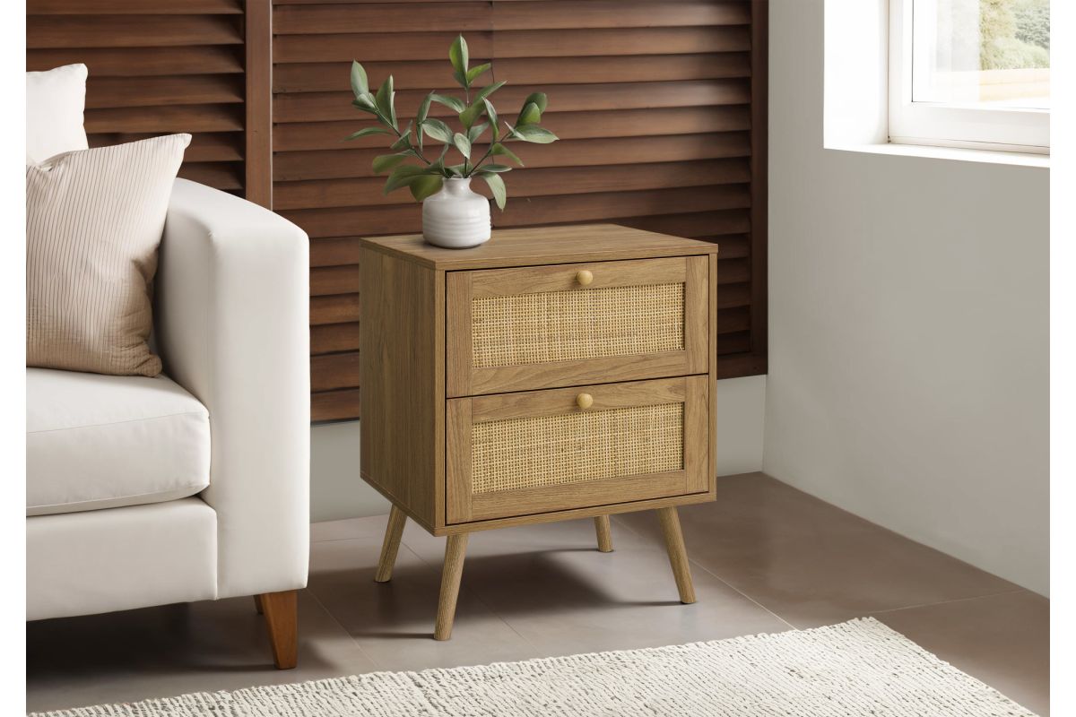 Stylish design meets practical functionality with this modern 24" accent table. This versatile table is perfect for any room, from your cozy bedroom to your trendy living room featuring a light walnut laminate finish on all sides that exudes casual sophistication. This durably designed end table is built with solid wood legs to provide a sturdy foundation, plus, with a space-saving design, this side table fits seamlessly into any corner, making it ideal for apartments and small homes. Built with two handy storage drawers, each accented with a rattan panel and wood handles for a contemporary boho vibe, offering the perfect solution to keep everything organized. The easy-to-clean top ensures that maintaining its pristine look is a breeze. Easy to assemble with full illustrated instructions included, allowing you to enjoy your new piece in no time. Plus, this table is backed by a 5 year limited warranty against manufacturer defects, giving you peace of mind alongside a chic new storage solution. Whether you use it as a nightstand or a side table, this accent table provides the perfect blend of modern convenience and contemporary charm.