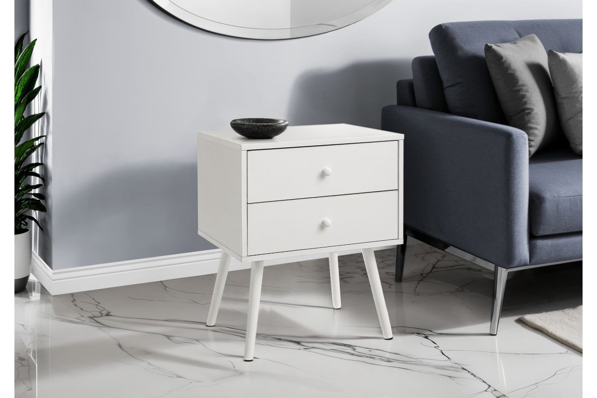 Introducing the ultimate accent table that seamlessly blends fashionable style with practical functionality! Standing at 24" high, this white laminate end table with a space saving design is the perfect addition to a small bedroom as a nightstand, living room, or any cozy nook in your home. With its simple, modern design this accent table is crafted with solid wood legs and durably designed to handle everyday life, while adding a touch of chic to your decor. Featuring two spacious storage drawers with wood handles, you can easily stow away your essentials, from books to remotes, ensuring your space remains organized without compromising on style. Plus, the easy to clean top means you can wipe away spills in a flash making maintenance a breeze. This accent table is easy to assemble with illustrated instructions included, allowing you to set it up and start enjoying its benefits in no time. To ensure your peace of mind, we include a 5 year limited warranty against manufacturer defects for this fabulous piece. Transform your contemporary home with this side table and discover how this stylish and practical furniture can elevate your space in ways you never imagined!