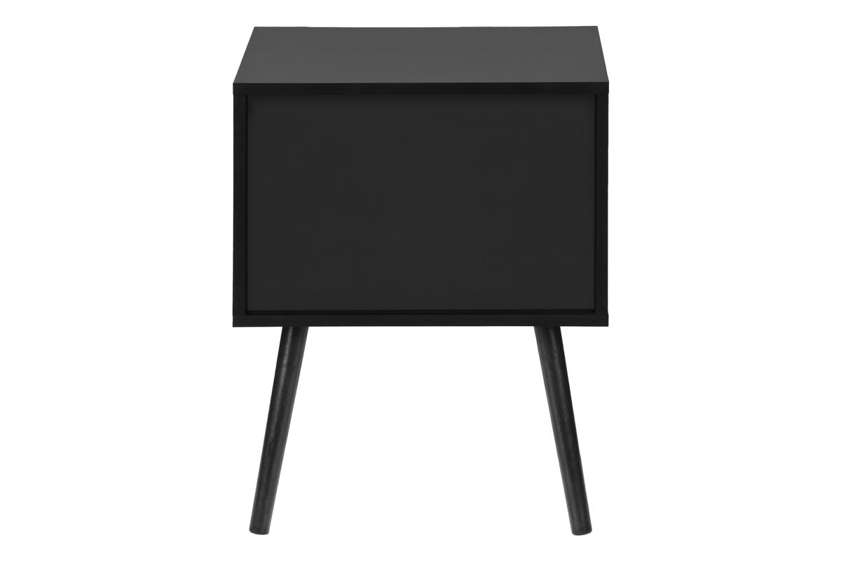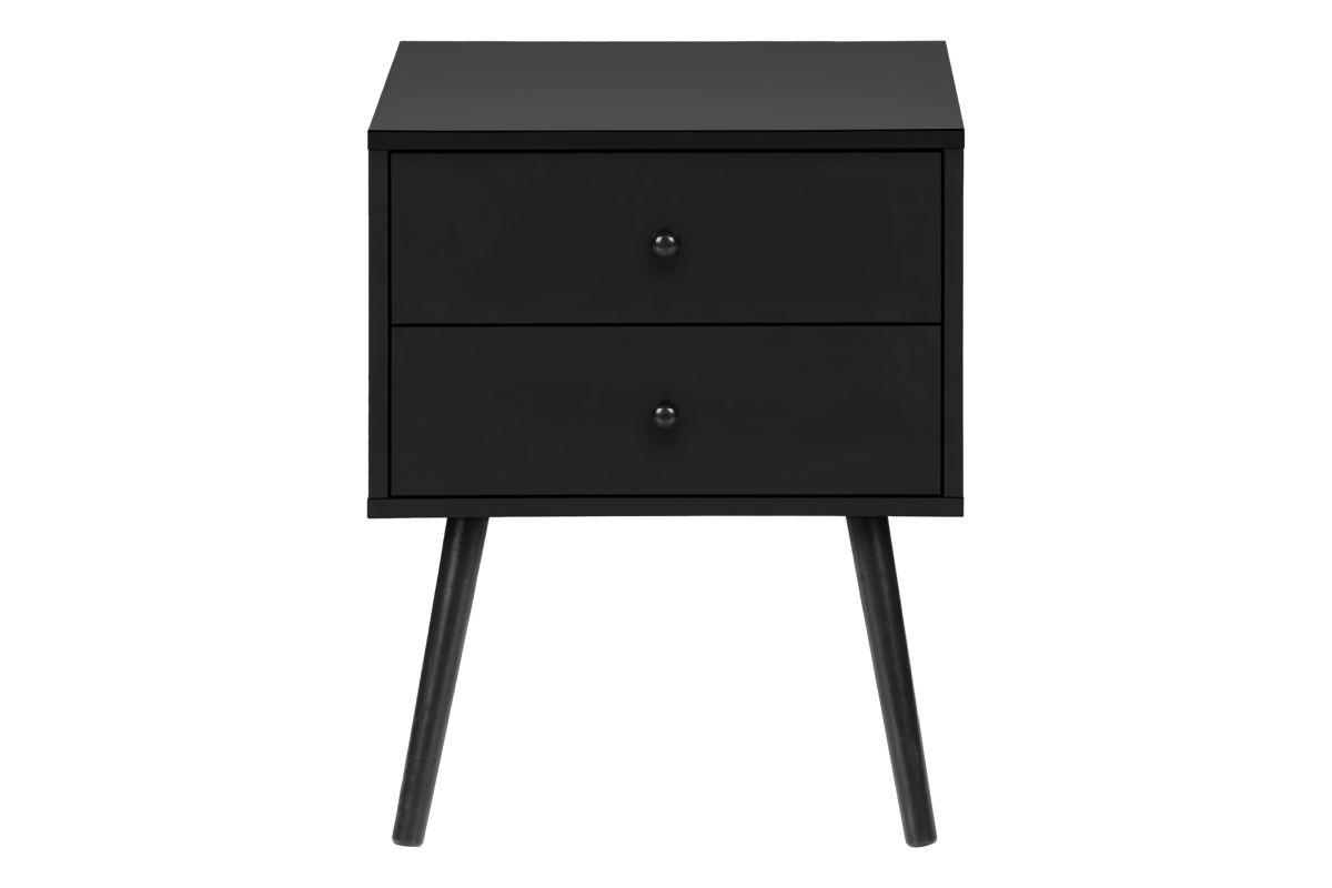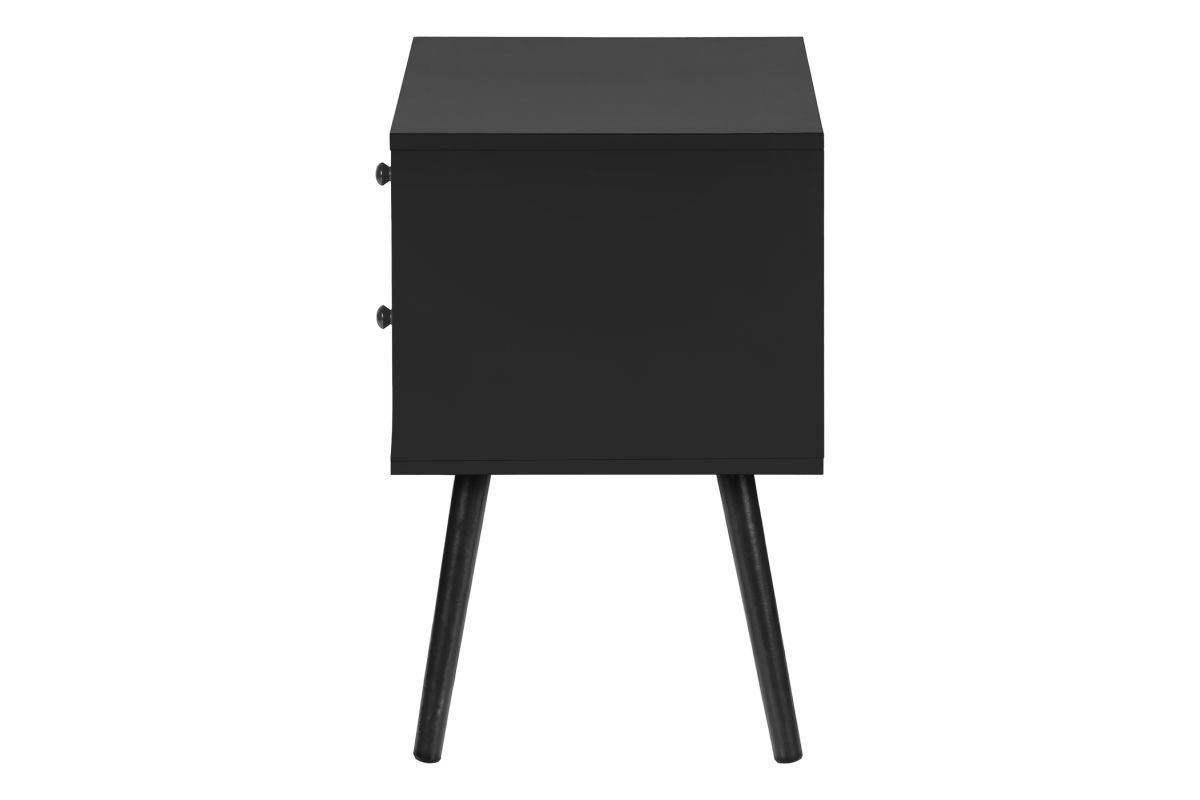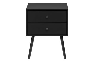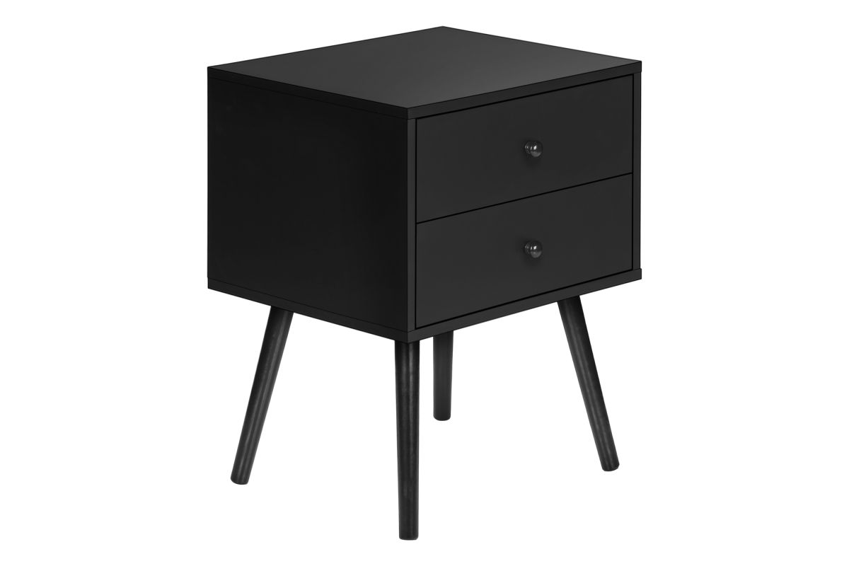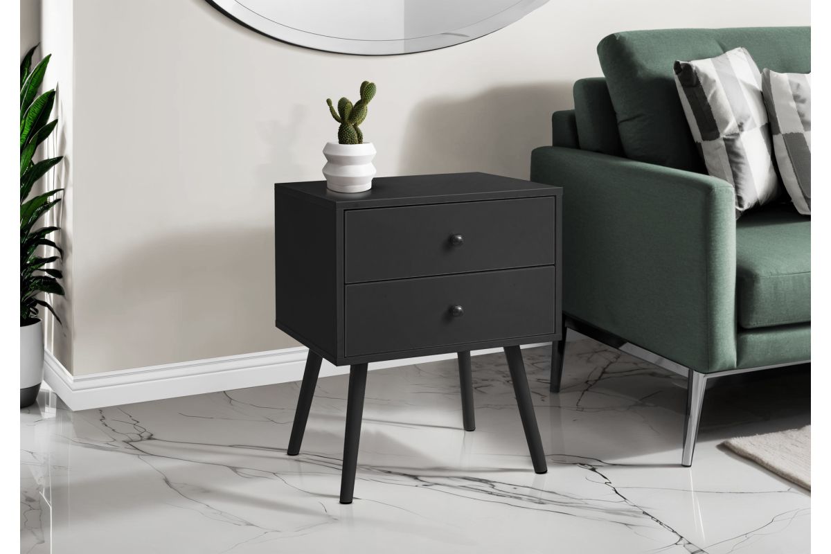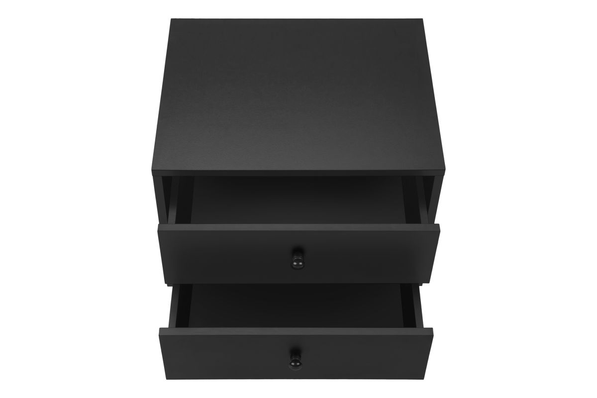 Introducing the ultimate accent table that seamlessly blends fashionable style with practical functionality! Standing at 24" high, this black laminate end table with a space saving design is the perfect addition to a small bedroom as a nightstand, living room, or any cozy nook in your home. With its simple, modern design this accent table is crafted with solid wood legs and durably designed to handle everyday life, while adding a touch of chic to your decor. Featuring two spacious storage drawers with wood handles, you can easily stow away your essentials, from books to remotes, ensuring your space remains organized without compromising on style. Plus, the easy to clean top means you can wipe away spills in a flash making maintenance a breeze. This accent table is easy to assemble with illustrated instructions included, allowing you to set it up and start enjoying its benefits in no time. To ensure your peace of mind, we include a 5 year limited warranty against manufacturer defects for this fabulous piece. Transform your contemporary home with this side table and discover how this stylish and practical furniture can elevate your space in ways you never imagined!