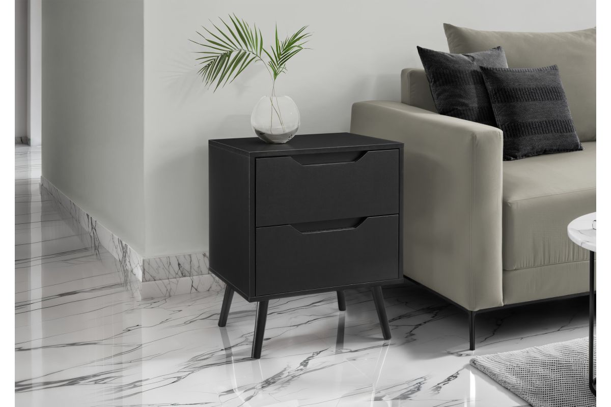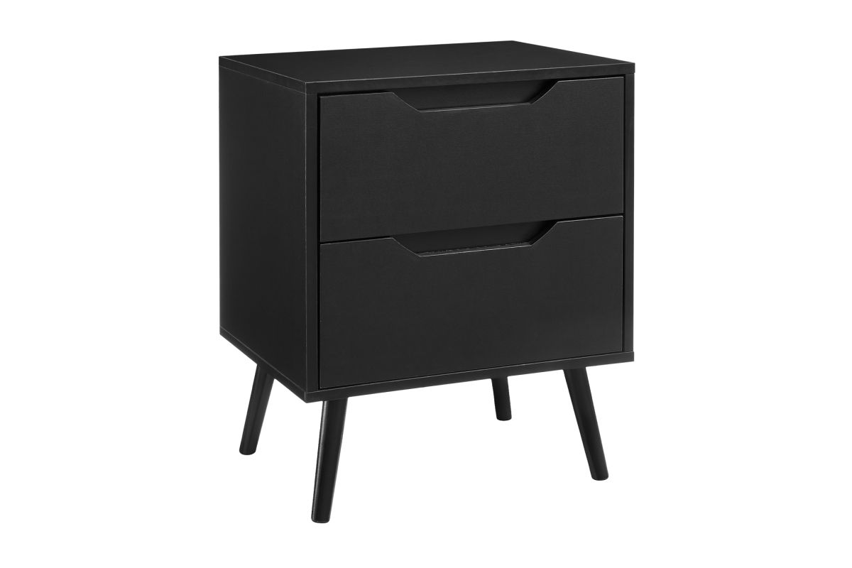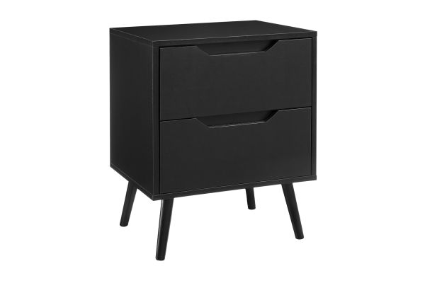 Compliment your living space with chic and stylish accent table that perfectly marries mid-century modern design with practical functionality. Standing at 24 high and finished in a smooth black laminate, this fashionable style side table with a space saving design, seamlessly fits into a contemporary bedroom as a nightstand or as an end table in a living room. Built with solid wood legs and an easy to clean top to withstand daily use, this side table not only enhances your decor but is durably designed to stand the test of time. Tucked beneath its elegant surface are 2 spacious storage drawers with recessed handles, ideal for stowing away your essentials, and maintaining a clutter-free space. This modern end table is easy to assemble with the included illustrated instructions, so you can enjoy your new piece in no time. Plus, our commitment to quality is backed by a 5 year limited warranty against manufacturer defects, giving you peace of mind with your purchase.