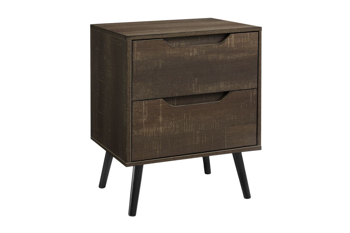 Compliment your living space with chic and stylish accent table that perfectly marries mid-century modern design with practical functionality. Standing at 24 high and finished in a smooth, wood-look dark brown laminate, this fashionable style side table with a space saving design, seamlessly fits into a contemporary bedroom as a nightstand or as an end table in a living room. Built with solid wood legs and an easy to clean top to withstand daily use, this side table not only enhances your decor but is durably designed to stand the test of time. Tucked beneath its elegant surface are 2 spacious storage drawers with recessed handles, ideal for stowing away your essentials, and maintaining a clutter-free space. This modern end table is easy to assemble with the included illustrated instructions, so you can enjoy your new piece in no time. Plus, our commitment to quality is backed by a 5 year limited warranty against manufacturer defects, giving you peace of mind with your purchase.