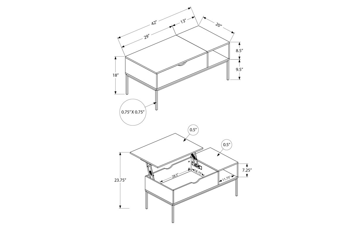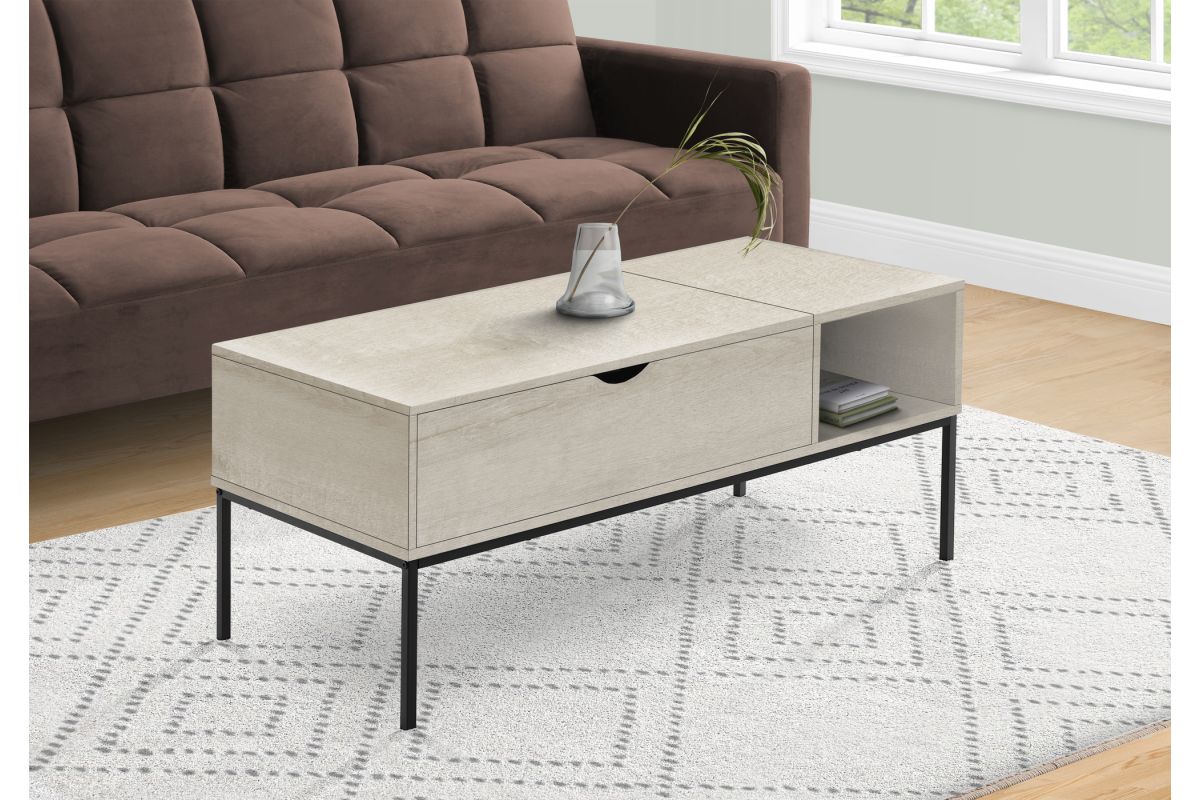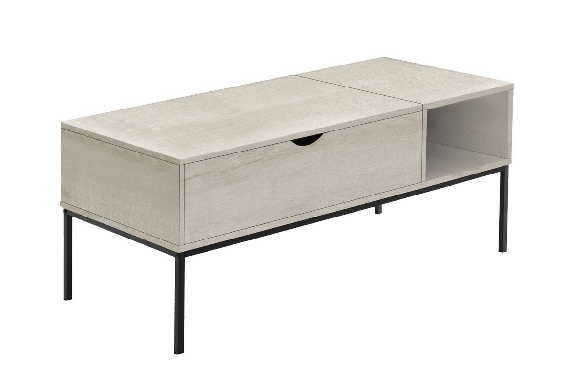 This contemporary style coffee table will be the showstopper in your living room. With its sleek and durably designed black metal frame and the 42" long rectangular tabletop in a modern washed oak laminate finish, it is the perfect combination of style and practicality. The convenient hinged lift-top gives you the flexibility to bring it closer so you can work on your laptop, have a meal or snacks, also providing generous hidden storage for remotes, books, and magazines. Once the easy to clean top is put it back in place you have a spacious cocktail table for entertaining! Extra storage is available with the open side shelf. Easy to assemble with full illustrated instructions and hardware included, all backed with a 5 year limited warranty against manufacturer's defects.