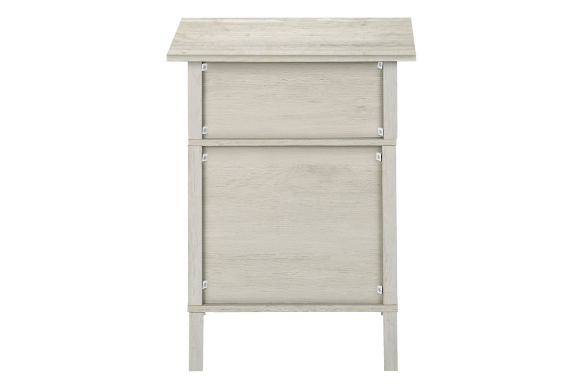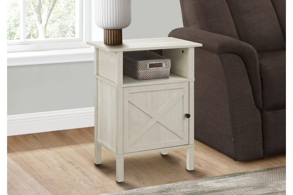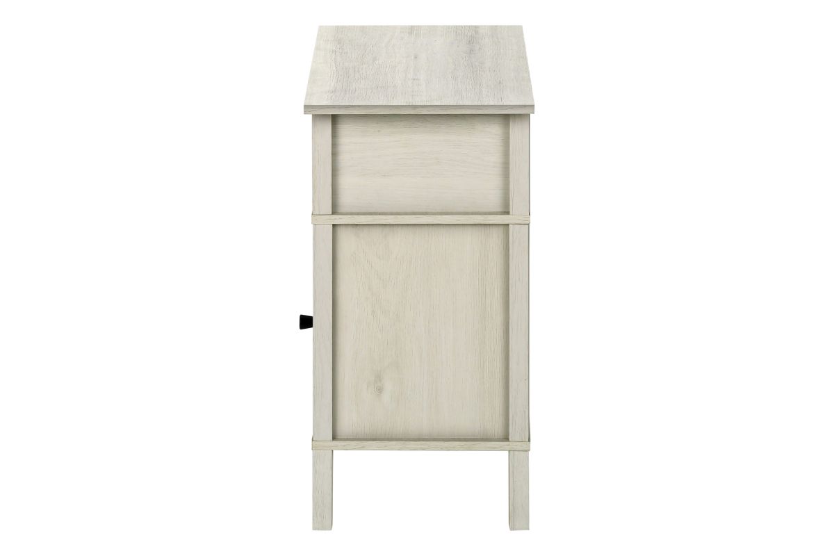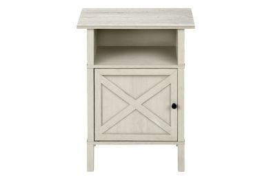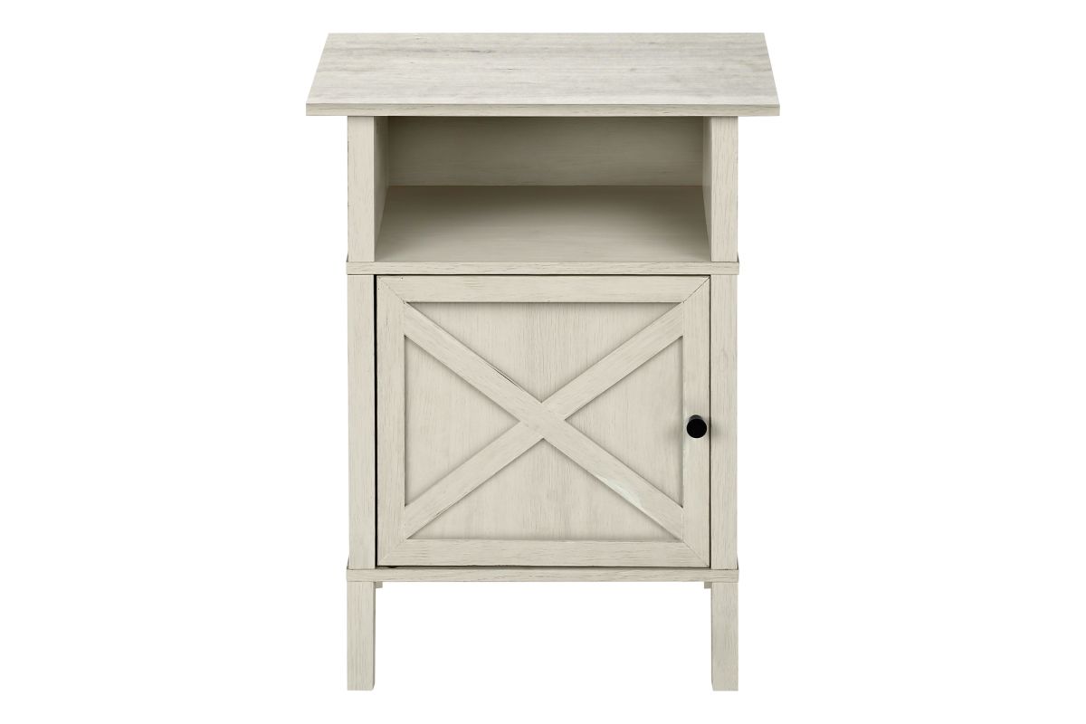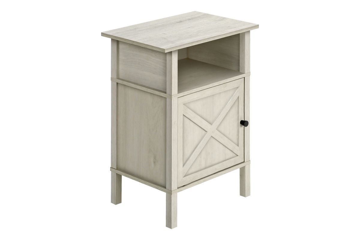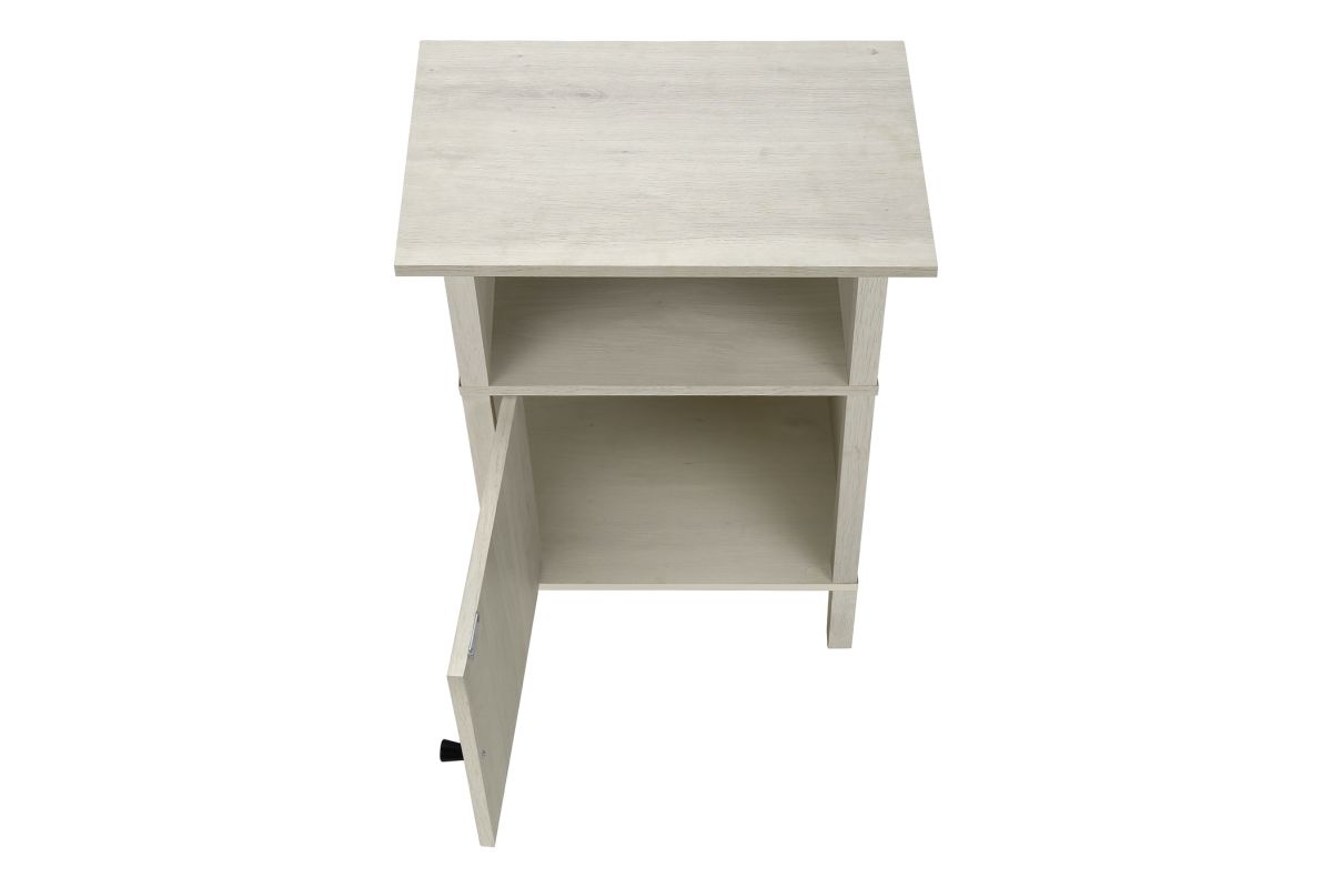Upgrade your living room or bedroom with this versatile side accent table. Standing at 24" tall, this stylish side table features a warm washed oak laminate finish on all sides, complimented with a classic black metal knob on the cabinet door. The durably designed construction ensures longevity, while the easy to clean top makes maintenance a breeze. With a practical open shelf and spacious closed cabinet for plenty of storage, this accent table is perfect for small rooms with its space saving design that is both functional and fashionable. Easy to assemble with illustrated instructions and floor protectors included, ready to setup and enjoy in no time. Backed by a 5 year limited warranty against manufacturer defects, this transitional end table is a must-have when freshening up your living space with some fashionable style.