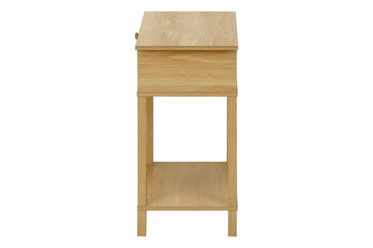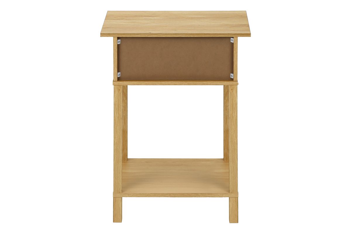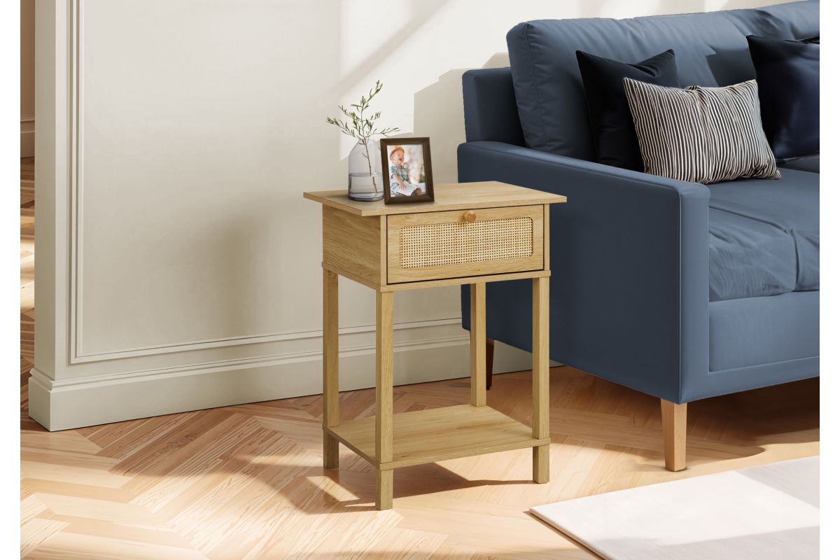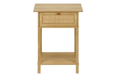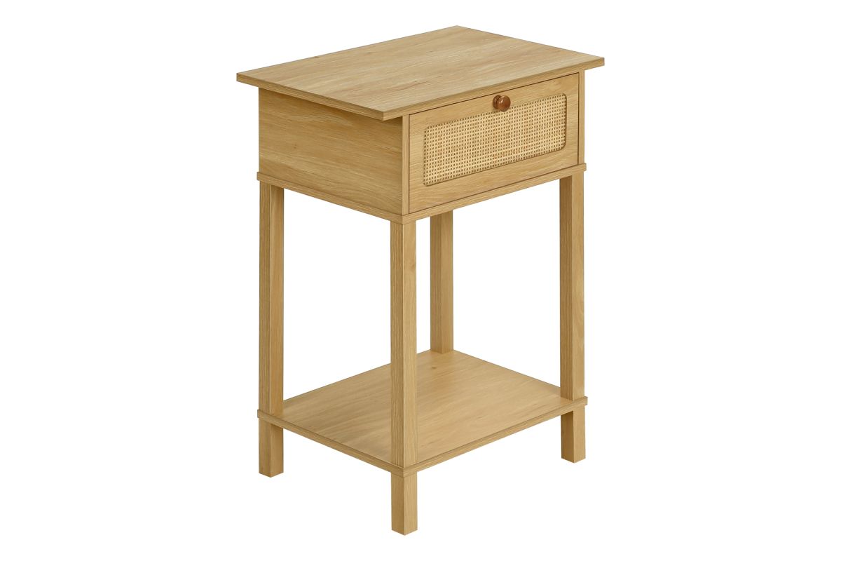 Bring some casual elegance to your space with this stylish accent table! Standing at 24" high, this practical and durably designed side table features a natural laminate finish and a convenient closed cubby with a drop down front, accented with a simple wooden knob and fashionable natural rattan panel for all your essentials. The 2-tier design with a shelf offers ample space for decor and storage, making it perfect for use as an end table, side table or nightstand in your bedroom or living room. Versatile, with a space saving design and an easy to clean top, this table is also easy to assemble with full illustrated instructions and floor protectors included. Backed by a 5 year limited warranty against manufacturer defects, this transitional style accent table is the perfect blend of fashion and function for your contemporary home.
