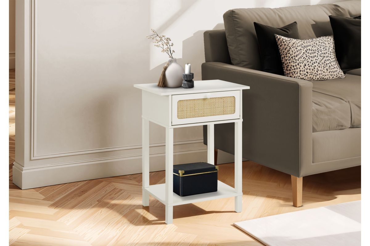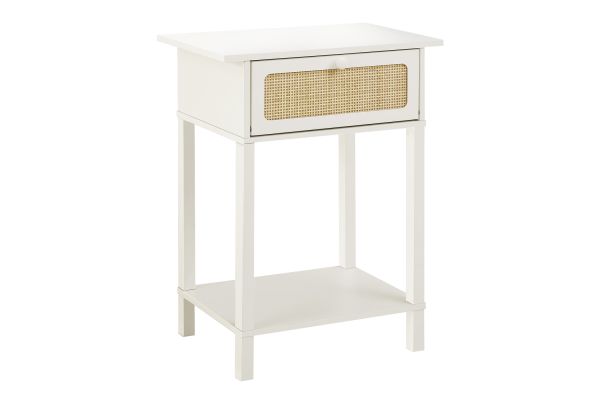 Bring some casual elegance to your space with this stylish accent table! Standing at 24" high, this practical and durably designed side table features a fresh white laminate finish and a convenient closed cubby with a drop down front, accented with a simple white wooden knob and fashionable natural rattan panel for all your essentials. The 2-tier design with a shelf offers ample space for decor and storage, making it perfect for use as an end table, side table, or nightstand in your bedroom or living room. Versatile, with a space saving design and an easy to clean top, this table is also easy to assemble with full illustrated instructions and floor protectors included. Backed by a 5 year limited warranty against manufacturer defects, this transitional style accent table is the perfect blend of fashion and function for your contemporary home.