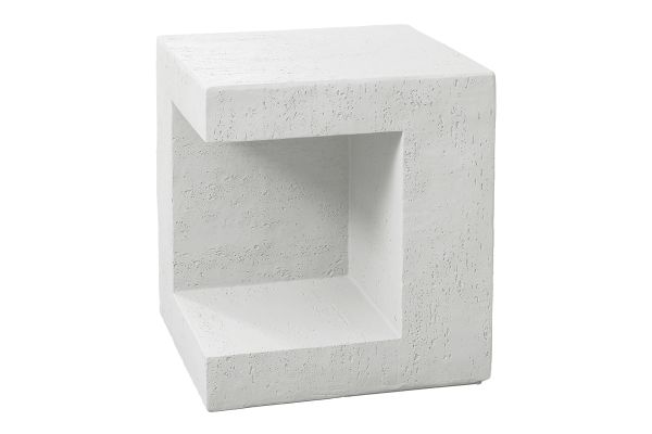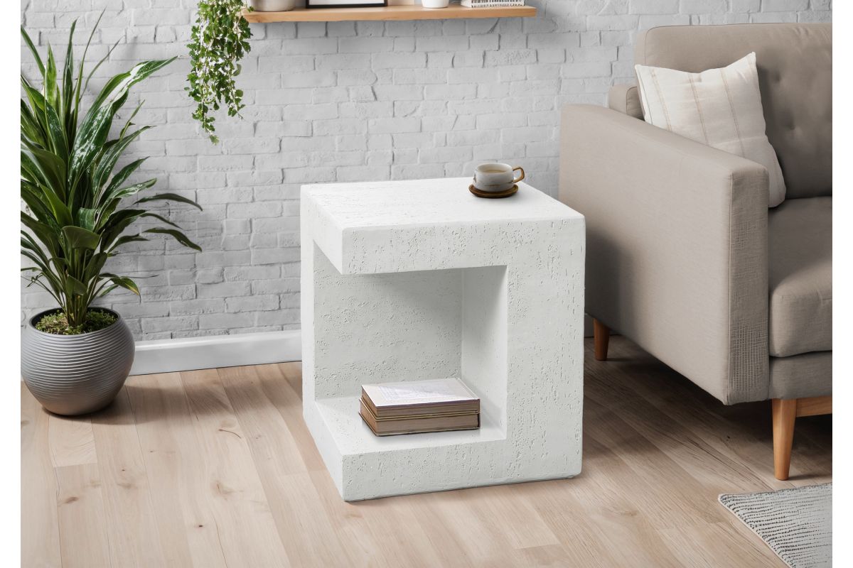 Transform your space with this modern, 25"h white accent table and elevate your home decor style. This versatile table is perfect for adding a touch of modern elegance to your bedroom, living room, or outdoor settings. This sophisticated, cube shaped side table with a cut-out design providing a bottom shelf for storage or display, features a durable and easy to clean top that withstands the rigors of indoor or outdoor use, ensuring it remains a staple in your home for years to come. Designed with practicality in mind with a space saving design, this table is created using weather-resistant magnesium oxide in a concrete look, making it perfect to setup on your contemporary patio as a chic side table, in a modern living room as an end table or in your bedroom as a unique nightstand. No assembly is needed, making it a breeze to simply place in your favorite space for an instant decorative lift. Plus, it comes with a 5 year limited warranty against manufacturer defects to ensure a quality made and lasting purchase. Upgrade your indoor/outdoor decor with this outstanding, concrete-look square accent table with its fashionable style that seamlessly blends with contemporary aesthetics, making it an ideal choice for any space.