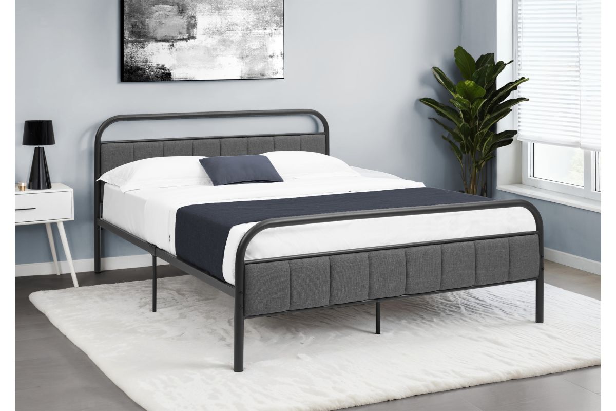 Let us introduce you to our stylish and contemporary version of a queen size metal platform bed that will transform your bedroom into a chic sanctuary. The black metal frame provides sturdy construction and is accented with an upholstered headboard and footboard in a luxurious grey linen-look, soft touch fabric with foam cushioning, adding a fashionable touch to any modern bedroom. With a minimalist yet stylish design, this bed frame requires no box spring. It has metal bars all along the base to support a standard queen size mattress (not included) for ultimate comfort. Plus, for added assurance, this platform bed comes with a 2 year limited warranty against manufacturer defects, so you can sleep soundly knowing you have a quality made and reliable bed frame. Easy to assemble with the illustrated instructions included, you will start to enjoy your fashionable style, new bedroom space in no time. Indulge in a sleep experience that is both elevated and practical with this modern, upholstered metal bed. This platform bed is for the frame only. Mattress sold separately.