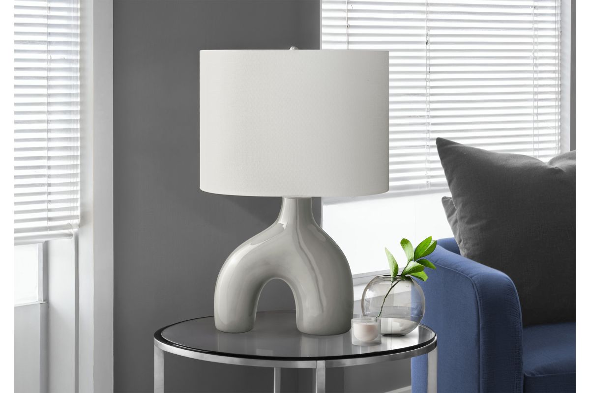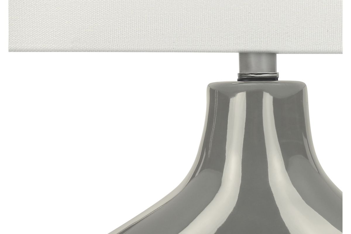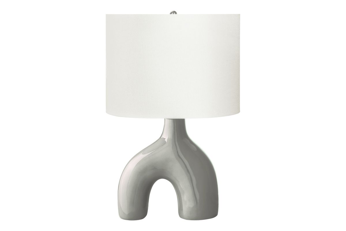 Add a fun and decorative element to your home with this stylish, mid-century inspired 25"h table lamp in light grey ceramic with an elegant linen ivory shade. This decorative table lamp will brighten up any room with its contemporary and whimsical two-leg shape ceramic base and linen-blend fabric shade. A perfect size to place on an end or side table in your living room or office, or as a bedside lamp on your nightstand in your bedroom, this lamp will illuminate any space with a soft and inviting ambiance. Easy to use with an on/off rotary switch that houses a 100W light bulb (not included), this lighting fixture will be a standout in your space. Only minimal assembly is needed and backed with a 2 year limited warranty against manufacturer defects, you can trust in the quality and durability of this unique accent piece.