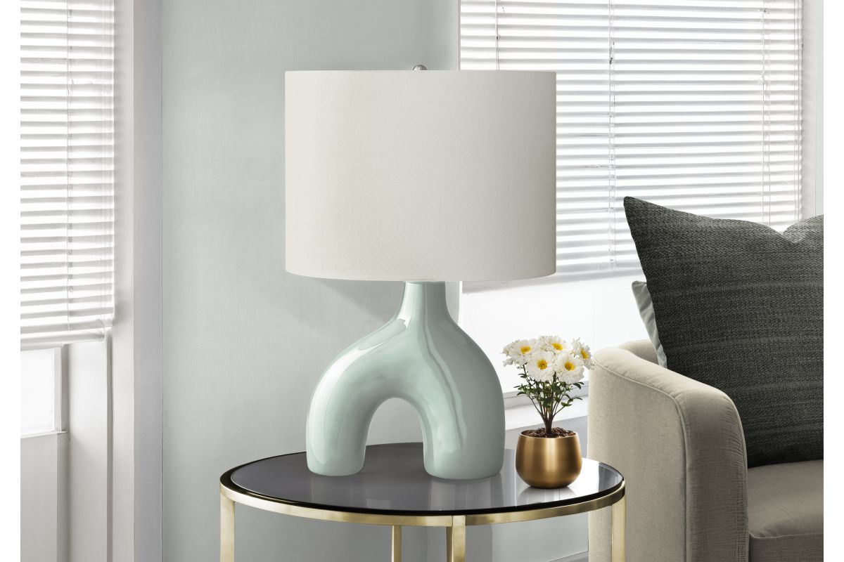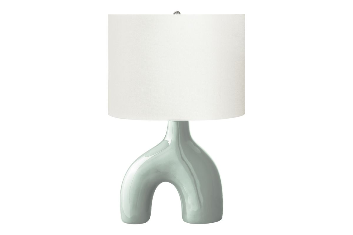 Add a fun and decorative element to your home with this stylish, mid-century inspired 25"h table lamp in light green ceramic with an elegant linen ivory shade. This decorative table lamp will brighten up any room with its contemporary and whimsical two-leg shape ceramic base and linen-blend fabric shade. A perfect size to place on an end or side table in your living room or office, or as a bedside lamp on your nightstand in your bedroom, this lamp will illuminate any space with a soft and inviting ambiance. Easy to use with an on/off rotary switch that houses a 100W light bulb (not included), this lighting fixture will be a standout in your space. Only minimal assembly is needed and backed with a 2 year limited warranty against manufacturer defects, you can trust in the quality and durability of this unique accent piece.