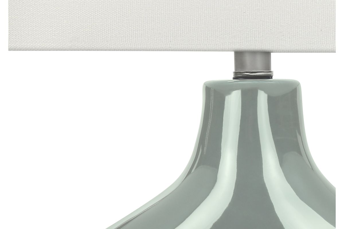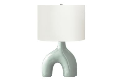- A contemporary and stylish 25"H table lamp featuring a unique two-leg shape light green ceramic base, topped with a classic ivory fabric shade and a round silver metal finial.