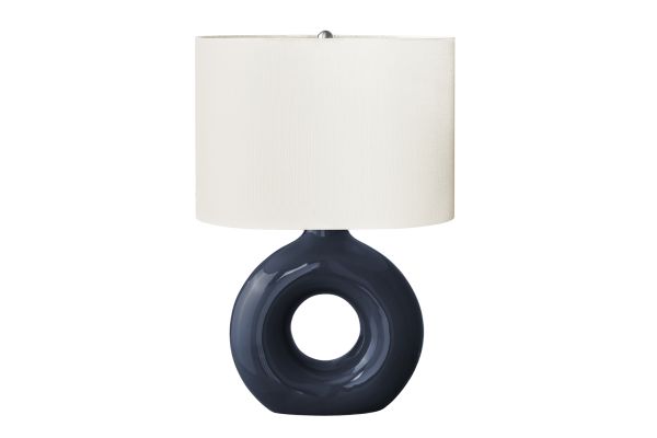 Add some modern ambiance to your home with this stylish and trendy 24"h table lamp in blue ceramic with a chic ivory shade. This decorative table lamp will brighten up any room with its contemporary, donut-shaped ceramic base and oval linen-blend fabric shade. A perfect size to place on an end or side table, or as a bedside lamp on your nightstand, this lamp will illuminate your space with a soft and inviting glow. Easy to use with an on/off rotary switch that houses a 100W light bulb (not included), this lighting fixture will easily be a standout. With only minimal assembly needed and backed with a 2 year limited warranty against manufacturer defects, you can trust in the quality and durability of this unique accent piece.