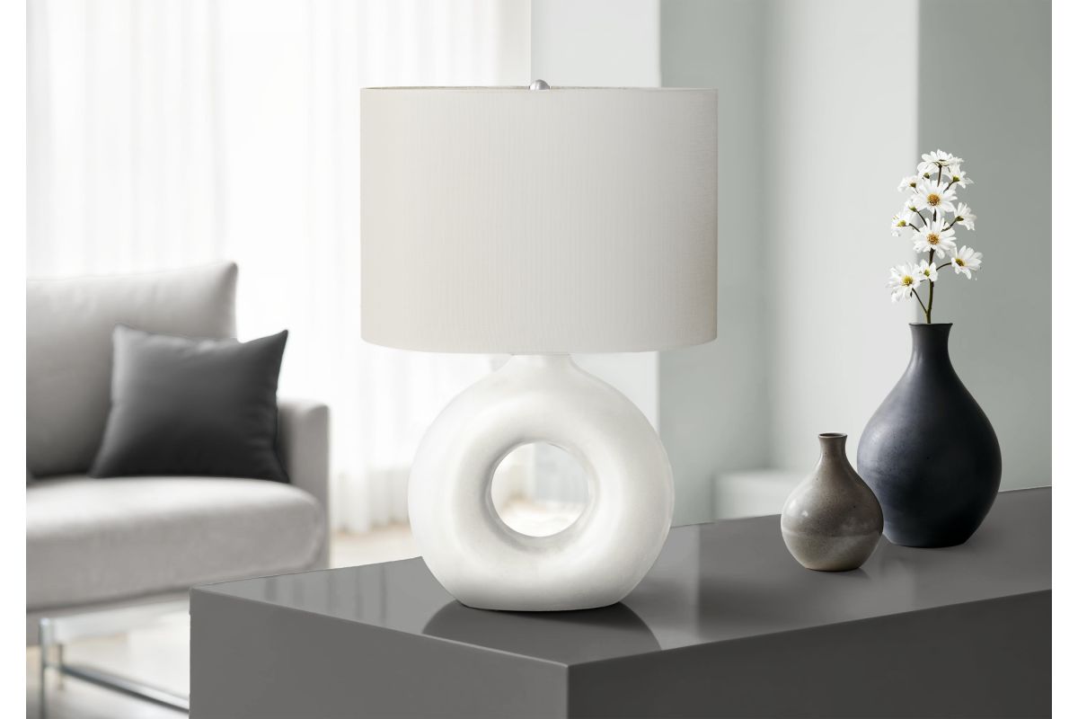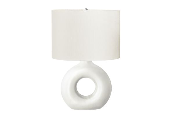 Add some modern ambiance to your home with this stylish and trendy 24"h table lamp in a matte white ceramic with a chic ivory shade. This decorative table lamp will brighten up any room with its contemporary, donut-shaped ceramic base and oval linen-blend fabric shade. A perfect size to place on an end or side table, or as a bedside lamp on your nightstand, this lamp will illuminate your space with a soft and inviting glow. Easy to use with an on/off rotary switch that houses a 100W light bulb (not included), this lighting fixture will easily be a standout. With only minimal assembly needed and backed with a 2 year limited warranty against manufacturer defects, you can trust in the quality and durability of this unique accent piece.