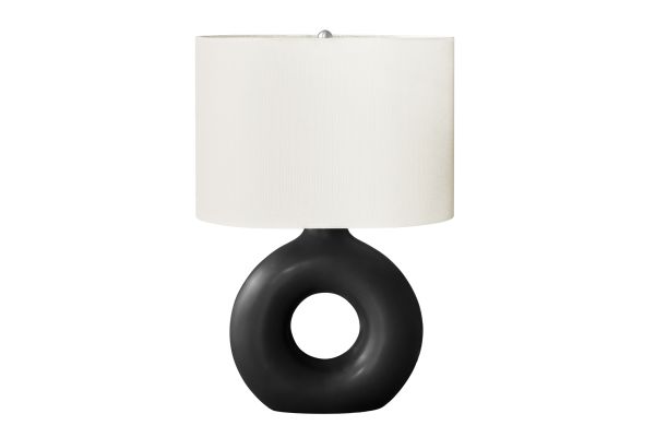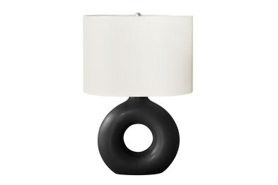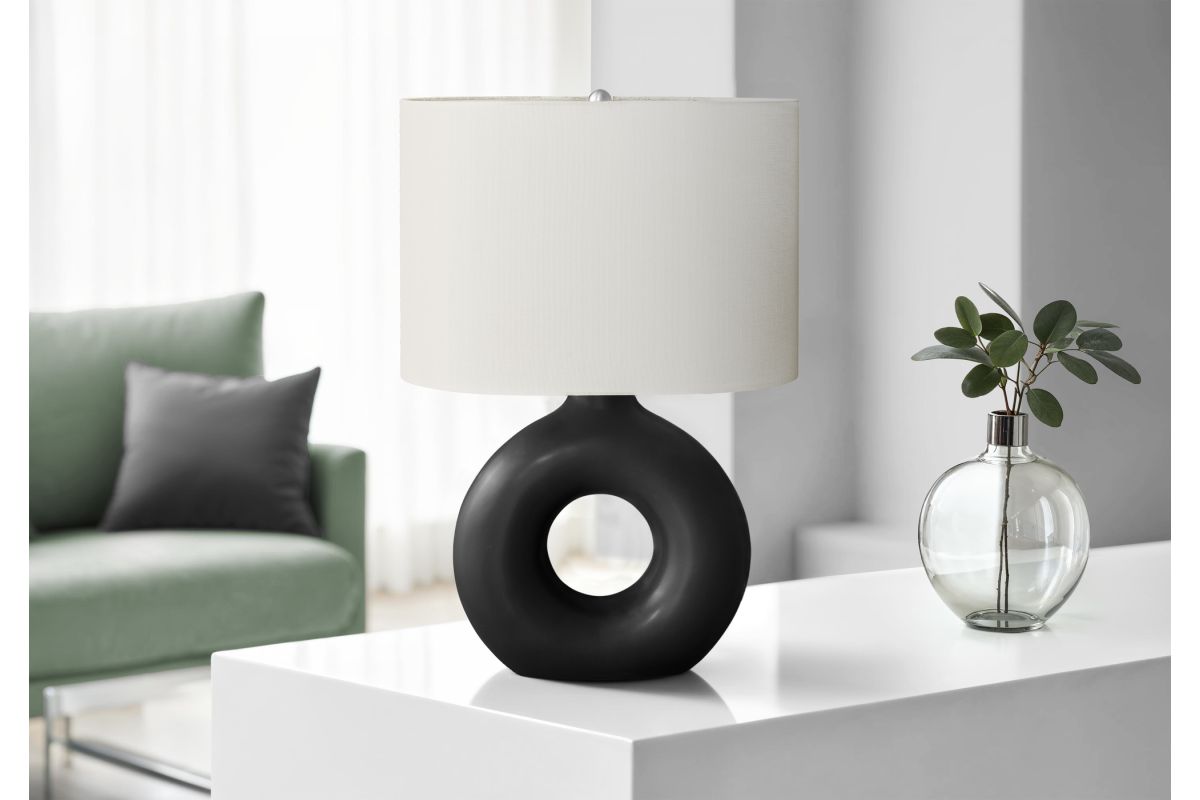 Add some modern ambiance to your home with this stylish and trendy 24"h table lamp in a matte black ceramic with a chic ivory shade. This decorative table lamp will brighten up any room with its contemporary, donut-shaped ceramic base and oval linen-blend fabric shade. A perfect size to place on an end or side table, or as a bedside lamp on your nightstand, this lamp will illuminate your space with a soft and inviting glow. Easy to use with an on/off rotary switch that houses a 100W light bulb (not included), this lighting fixture will easily be a standout. With only minimal assembly needed and backed with a 2 year limited warranty against manufacturer defects, you can trust in the quality and durability of this unique accent piece.