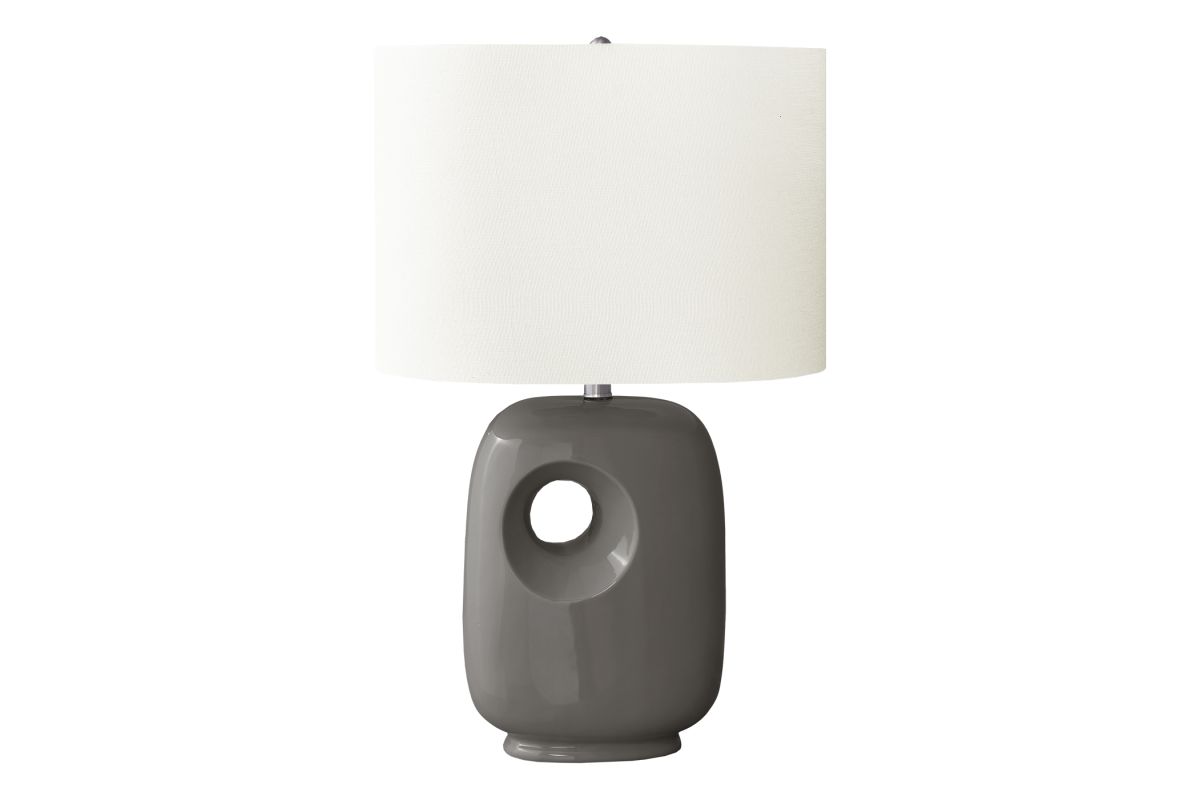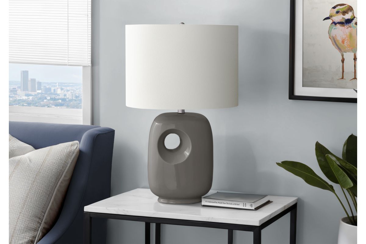 Illuminate your space with this modern and trendy 26"h table lamp with a sleek dark grey ceramic base and topped with a linen-blend, ivory fabric shade. The architectural and contemporary cut-out design on this lighting piece will easily brighten and elevate your home decor whether placed on an end or side table, or on a nightstand as a chic decorative and functional accent. The convenient on/off rotary switch operates up to a 100W bulb (not included) to instantly brighten up a living room, office, or bedroom space. Only minimal assembly is required, and this eye-catching lamp will be ready to add some fashionable and functional ambiance to a room. Made with high quality materials, this decorative lamp is backed by a 2 year limited warranty against manufacturer defects for your satisfaction.