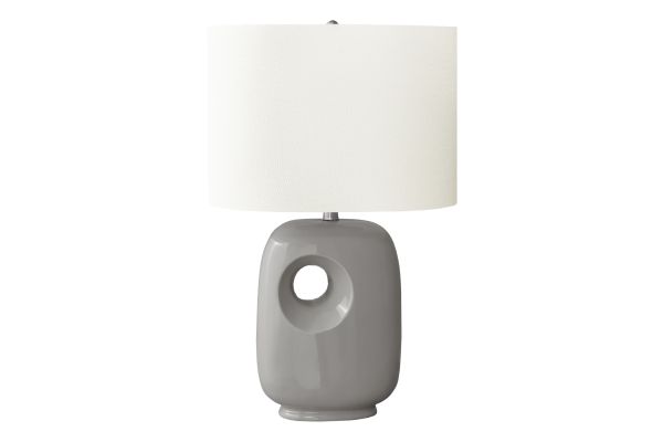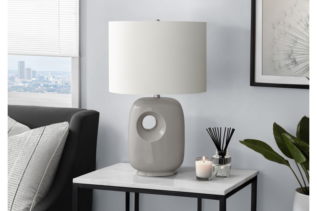 Illuminate your space with this modern and trendy 26"h table lamp with a sleek light grey ceramic base and topped with a linen-blend, ivory fabric shade. The architectural and contemporary cut-out design on this lighting piece will easily brighten and elevate your home decor whether placed on an end or side table, or on a nightstand as a chic decorative and functional accent. The convenient on/off rotary switch operates up to a 100W bulb (not included) to instantly brighten up a living room, office, or bedroom space. Only minimal assembly is required, and this eye-catching lamp will be ready to add some fashionable and functional ambiance to a room. Made with high quality materials, this decorative lamp is backed by a 2 year limited warranty against manufacturer defects for your satisfaction.