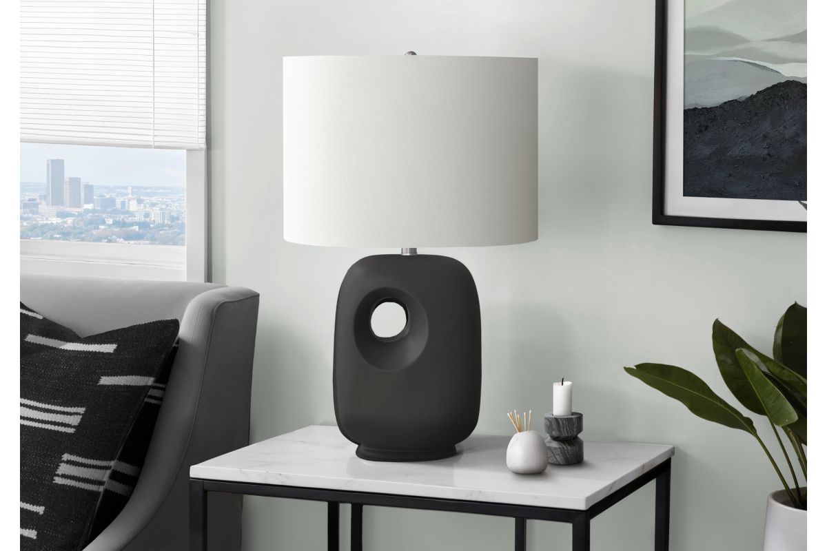 Illuminate your space with this modern and trendy 26"h table lamp with a sleek black ceramic base and topped with a linen-blend, ivory fabric shade. The architectural and contemporary cut-out design on this lighting piece will easily brighten and elevate your home decor whether placed on an end or side table, or on a nightstand as a chic decorative and functional accent. The convenient on/off rotary switch operates up to a 100W bulb (not included) to instantly brighten up a living room, office, or bedroom space. Only minimal assembly is required, and this eye-catching lamp will be ready to add some fashionable and functional ambiance to a room. Made with high quality materials, this decorative lamp is backed by a 2 year limited warranty against manufacturer defects for your satisfaction.